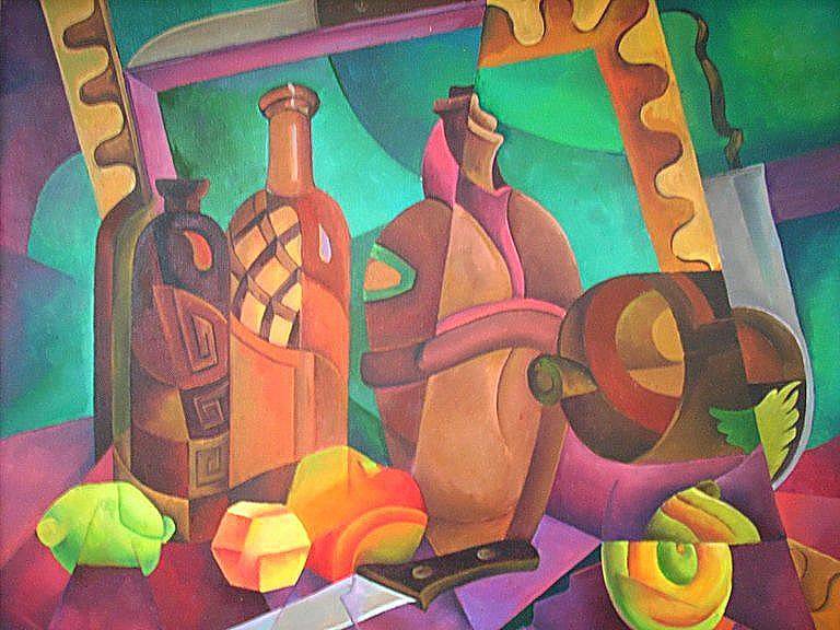 Obraz, który widzimy, to prawdziwa mieszanka chaosu i harmonii. Kolory są intensywne, dominują ciepłe odcienie zieleni, pomarańczu i brązu. Wszystko to tworzy kalejdoskop kształtów, które są zarówno płynne, jak i geometryczne. Przedstawione butelki i owoce zdają się tańczyć na powierzchni płótna, a ich sylwetki są zdeformowane niczym w magicznym lustrze. Kompozycja jest dynamiczna, pełna ruchu i życia. Artyście udało się uchwycić coś ulotnego, niemal jakby obraz oddychał. Atmosfera tego dzieła jest radosna, wręcz śmieszna w swojej kreatywnej ekspresji. Styl jest wyraźnie inspirowany kubizmem, z ostrymi liniami i przenikającymi się płaszczyznami, które tworzą wrażenie trójwymiarowości. Te zabiegi artystyczne nadają obrazowi unikalny charakter, zachęcając odbiorcę do zanurzenia się w jego świecie. Możliwe, że wywoła to u kogoś poczucie nostalgia, a u innego śmiech. Jedno jest pewne: to obraz, który zapada w pamięć. Patrzę na te abstrakcyjne formy i czuję się, jakbym właśnie znalazł się w środku surrealistycznego snu. Może nawet trochę "crazy". Dziecko powiedziałoby: "Te butelki wyglądają jakby miały buzie!". I w tym tkwi magia sztuki - każdy może zobaczyć coś innego. Te intensywne kolory i zawiłe kształty potrafią naprawdę uruchomić wyobraźnię. Czasem myślę, że to właśnie takie obrazy przypominają, jak ważna jest zabawa w życiu i sztuce.