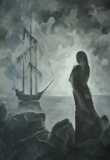 Obraz emanuje tajemniczością i mrokiem, od razu przyciągając wzrok monochromatycznym zestawieniem szarości. W centralnej części kompozycji widzimy samotną postać stojącą na skalistym wybrzeżu. Kobieta, ubrana w długie szaty, patrzy w dal, gdzie na horyzoncie widnieje zamglony statek o smukłych masztach. Chmury gromadzą się nad wodą, tworząc dramatyczne, ale jednocześnie spokojne tło. Technika malarska jest pełna miękkich pociągnięć pędzla, co dodaje subtelności i dynamiki, a cienie i światło delikatnie się przenikają. Obraz ma nastrój nostalgii, a może nawet smutku, lecz czuć też pewną nadzieję, jakby chwila tuż przed burzą mogła przynieść coś nowego. Styl malowania przywodzi na myśl klasyczną sztukę romantyzmu, gdzie emocje i przyroda łączą się w jedno, nieco jak w magiczny sposób. Odbiorca może poczuć się trochę zagubiony, a jednak zafascynowany, zastanawiając się, jaka historia kryje się za tą sceną. Takie dzieło wywołuje intrygujące pytania i tęsknotę za nieznanym. Patrząc na nie, myślałem o tym, jak ulotne może być życie i jak wiele tajemnic czeka za horyzontem. Wow, a statek taki ładny! To było jedno z tych spontanicznych spostrzeżeń, jakie przychodzą do głowy, przypominając dziecięcą radość odkrywania. Całość sprawia, że czujesz się częścią czegoś większego.