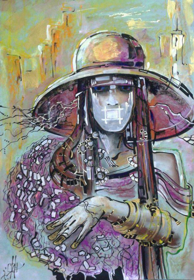 Ten obraz to istna mieszanka kolorów i kształtów, które hipnotyzują na pierwszy rzut oka. Dominują tutaj ciepłe odcienie pomarańczu i purpury, które zdają się płonąć w mglistym tle. Kobieta w kapeluszu z wielkim rondem zajmuje niemal całą kompozycję, a jej spojrzenie jest zamglone tajemnicą. Przypomina trochę baśniową postać, co przypomina o dziecięcych snach. Linia wokół konturów postaci jest mocna i zdecydowana, co przyciąga uwagę do najważniejszych elementów obrazu. The atmosphere? Zdecydowanie dreamlike. Czujesz, jakbyś przeniósł się do innego świata, gdzie wszystko jest możliwe. Styl artystyczny przywodzi na myśl surrealizm i kubizm, z lekko abstrakcyjną nutą. Elementy geometryczne przenikają przez całą kompozycję, co nadaje jej dynamizmu. Można by rzec, że artysta bawi się formą i kolorem jak dziecko z klockami Lego. Obraz wywołuje emocje od zadumy po zachwyt. Może nawet lekkie zaniepokojenie, jak to bywa z niektórymi snami. Patrząc na niego, poczułam przyjemne ciepło w sercu i myśl "jakie to piękne". Uzmysławiam to sobie na nowo, gdy patrzę na nią i widzę, jak delikatnie ułożone są ręce. A może próbuję zrozumieć, co chciała nam przekazać ta tajemnicza postać? Nawet mała myśl typu "Oo, pięknie" przebiega przez głowę, gdy się zagłębiać w jego magię.
