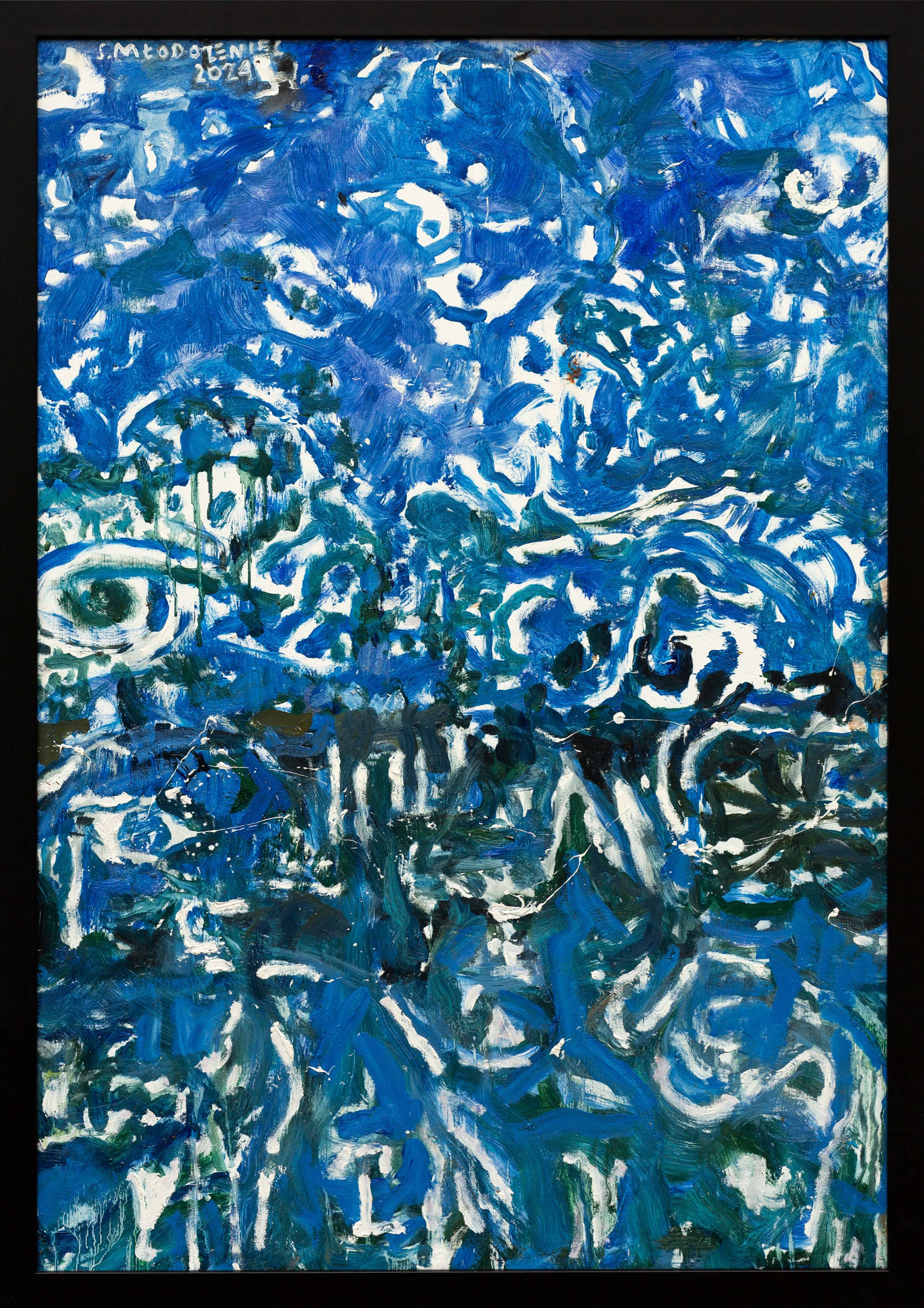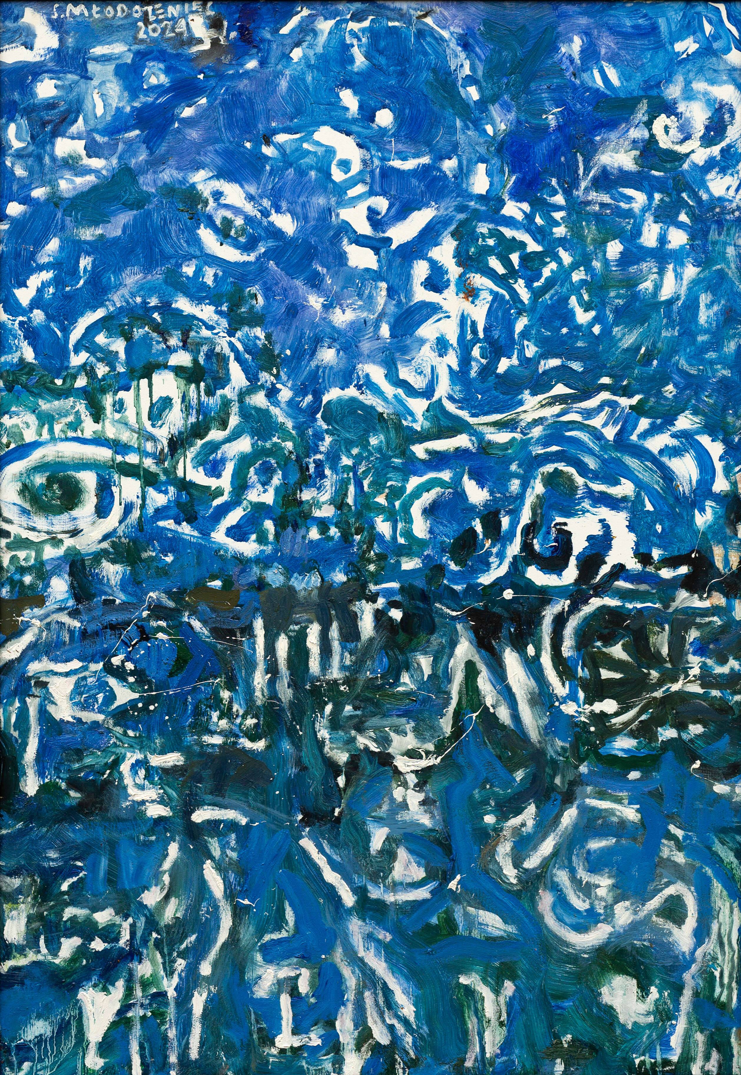Obraz rozgrywa się niczym symfonia błękitów, bieli i zieleni, rozlewając się malowniczo po płótnie. Chaotyczne pociągnięcia pędzla układają się w szaleńczą kompozycję pełną wirów i falujących kształtów. Dominuje niebieski, tworząc atmosferę spokoju, ale też tajemnicy. Praca zdaje się wrzeć energią, jakby tworzyła swój własny rytm. Artysta zdecydowanie zastosował technikę impasto, co widać w gęstej, niemal trójwymiarowej teksturze farby. Obraz przypomina abstrakcyjny pejzaż, może ocean czy gęsty las. Jest taki intrygujący, że nie mogę oderwać oczu. Taki styl pozwala na szeroką interpretację. Patrząc głębiej, można poczuć poczucie zagubienia, ale i spokój. Dziecko powiedziałoby: "To wygląda jak woda płynąca po chmurach”. Czyż nie jest to fitting? Osobiście czuję się uspokojony i zaintrygowany, jakby obraz opowiadał niekończącą się historię. Jego estetyka przyciąga swoją niejednoznacznością, zachęcając do snucia własnych opowieści i emocji.