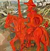 Na obrazie dominują odcienie czerwieni, które wypełniają postać mężczyzny na koniu, tworząc dynamiczne wrażenie ruchu. Intensywna barwa kontrastuje z bardziej stonowanym tłem — krajobrazem z wiatrakami i zamkiem, które rozpływają się w nieco zgaszonych szarościach i błękitach nieba. Kompozycja obrazu jest dość surowa, ale pełna energii. Malarz zastosował technikę szerokich pociągnięć pędzla, co dodaje całości wyrazistości. Atmosfera jest trochę tajemnicza i nostalgiczna. Wyobrażam sobie, że postać to Don Kichot, który wyrusza na przygodę. To, co od razu przykuwa uwagę, to surrealistyczny styl, w którym te barwy, te formy, układają się w coś zaskakującego. Obraz emanuje energią i trochę szaleństwa, jakby mówił mi — "hej, poczuj ten wiatr przygody!" A może to po prostu echo dziecięcej fantazji "Chcę być rycerzem!" widzę w tej kompozycji. With just a hint of mystery, przekazuje uczucia determinacji i dążenia do marzeń. Malarz złapał moment pełen marzycielskiej dynamiki.