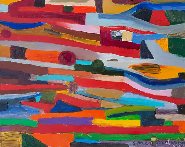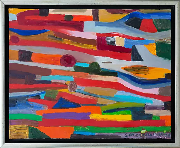 Na obrazie widzimy feerię barw połączoną w dynamiczną kompozycję linii i kształtów. Przeważają czerwienie, pomarańcze, błękity i zielenie, które razem tworzą kalejdoskop kolorów. Te linie wyglądają jak strumienie energii płynące przez płótno, a kształty, czasami nieregularne, czasami zaokrąglone, dodają dziełu ruchu. Obraz emanuje radością i spontanicznością, ale także pewnym chaosem. Atmosfera jest żywa, można by powiedzieć pulsująca muzyką. Styl, jakim posłużył się artysta, to abstrakcja, która zaprasza do własnej interpretacji. Technika użycia intensywnych, dynamicznych pociągnięć pędzla sprawia, że dzieło jest full of life. Patrząc na nie, można poczuć, jakby artysta chciał uchwycić chwilę pełną emocji i energii. Dzieciak by powiedział: to takie kolorowe węże na desce! Osobiście, obraz mnie uspakaja, mimo tej całej intensywności. Zabiera mnie w świat, gdzie reguły sztuki są tylko umowne. Jeden rzut oka i czuję się, jakbym podróżował w czasie, jakby kolor czas mógł zdefiniować. Coś magicznego tkwi w tej abstrakcji, która zmusza do refleksji na temat tego, jak postrzegamy rzeczywistość.