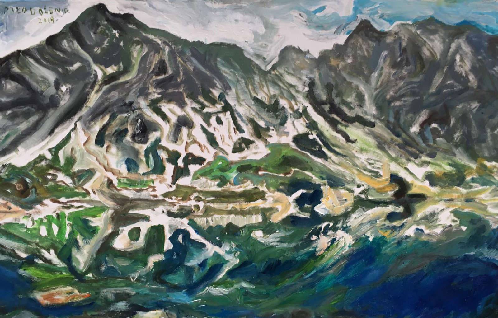 Obraz przedstawia górski krajobraz, pełen wyrazistych kształtów i dynamicznych pociągnięć pędzla. Dominują w nim odcienie zieleni, błękitu i szarości, które tworzą harmonijną, choć nieco chaotyczną kompozycję. Góry, jakby wyrastały z płótna, ożywiając przestrzeń swoją surową potęgą. Powietrze jest jakby ciężkie, napęczniałe chwilą nadciągającej burzy. Styl tego dzieła przypomina trochę impresjonizm, choć z nutą ekspresji. Artysta z pewnością posłużył się techniką alla prima, malując szybko, niemal intuicyjnie. Te zdecydowane pociągnięcia pędzla, dynamiczne i nieuporządkowane, wprowadzają w dzieło pewną ekscytację. A może nawet chaos. Patrząc na to, możesz poczuć się trochę zagubionym. Jakbyś stał na środku górskiej ścieżki, niepewny, co za zakrętem. Czy nie jest to takie "mystery" jak w opowieściach? Uwielbiam, jak obraz ukazuje tę dziką, nieskalaną naturę. I nawet gdy spogląda na mnie mały chłopiec, jego prostota pytań: "Czemu niebo jest takie bure?" sprawia, że uśmiecham się do własnych myśli.
