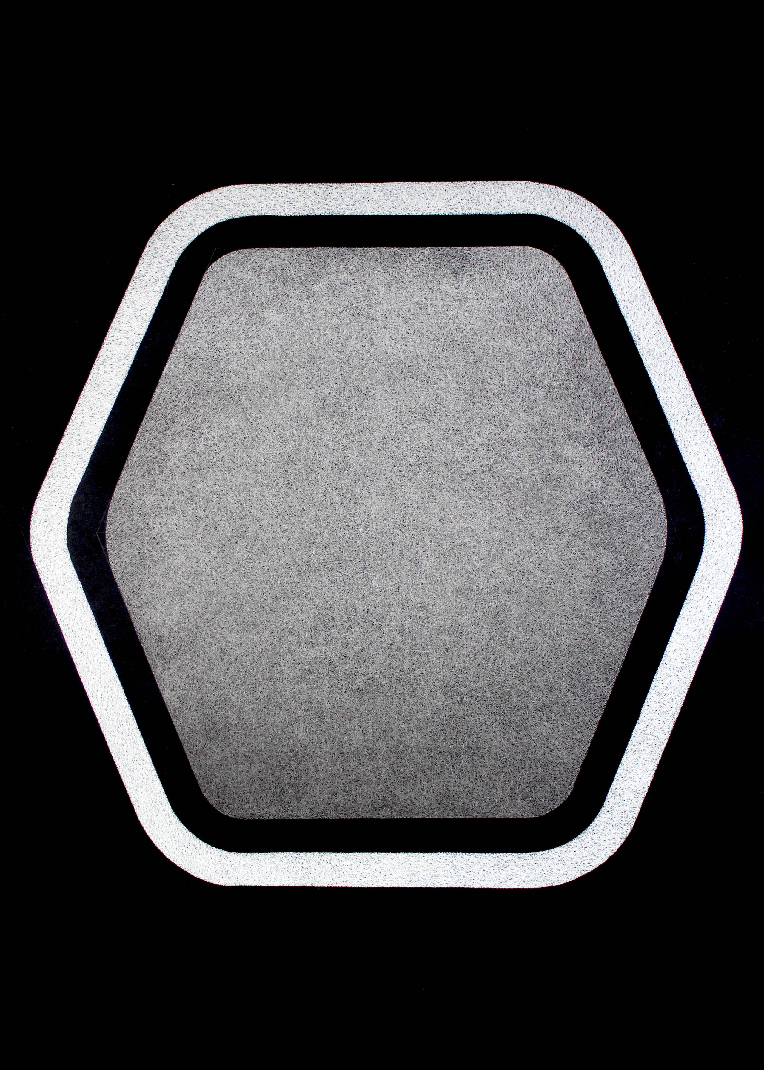 Rysunek z cyklu "Geometron - w hołdzie Kazimierzowi Malewiczowi" wykonany tuszami na czarnym kartonie z 2018 roku.