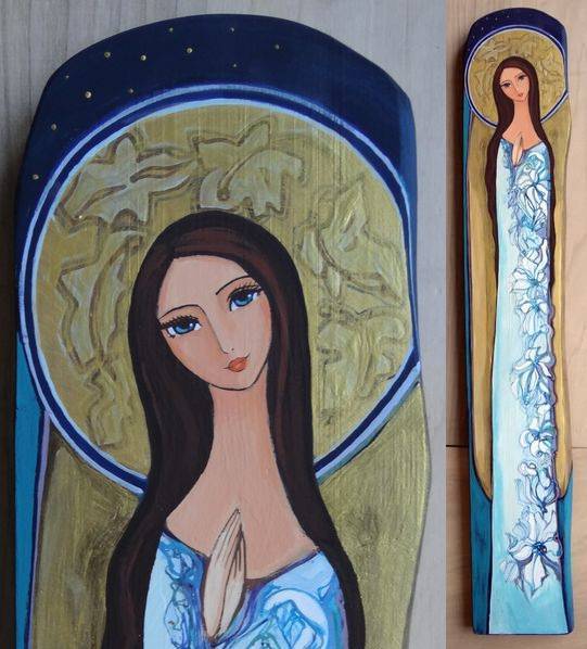 Obraz wykonany włoskimi farbami akrylowymi na zabezpieczonej dębowej desce o oryginalnym nieregularnym kształcie, ( lite drewno), artysta wykorzystał naturalne walory każdej deski: fakturę, słoje drewna czy spękania do stworzenia unikatowego obrazu... wysokość - ok. 85,5 cm szerokość (w najszerszym miejscu) - ok. 15 cm grubość podobrazia - ok. 2 cm Obraz jest zabezpieczony werniksem półmatowym, gotowy do zawieszenia, nie wymaga dodatkowej oprawy: boki i tył obrazu zamalowane w tonacji.