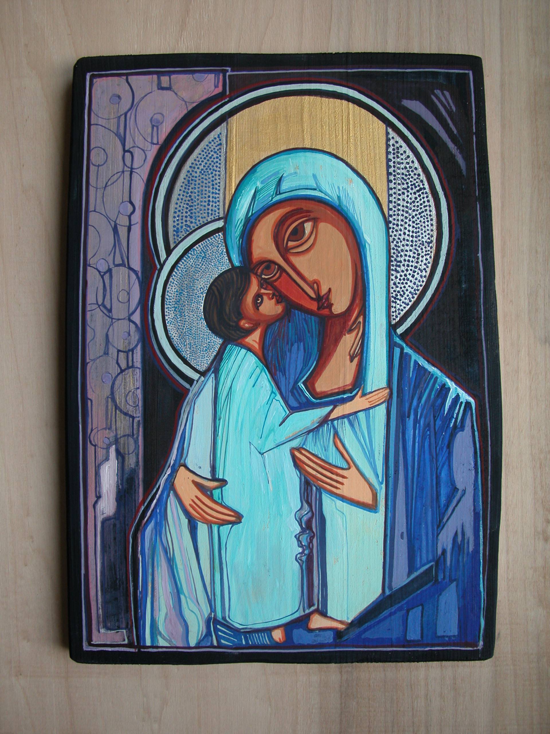Matka Boża z Dzieciątkiem Obraz z cyklu współczesne ikony autorskie, wykonany włoskimi farbami akrylowymi na litym drewnie, zabezpieczony werniksem półmatowym, nie wymaga oprawy, jest gotowy do zawieszenia. Wymiary : 37,5 cm x 26,5 cm x 2 cm