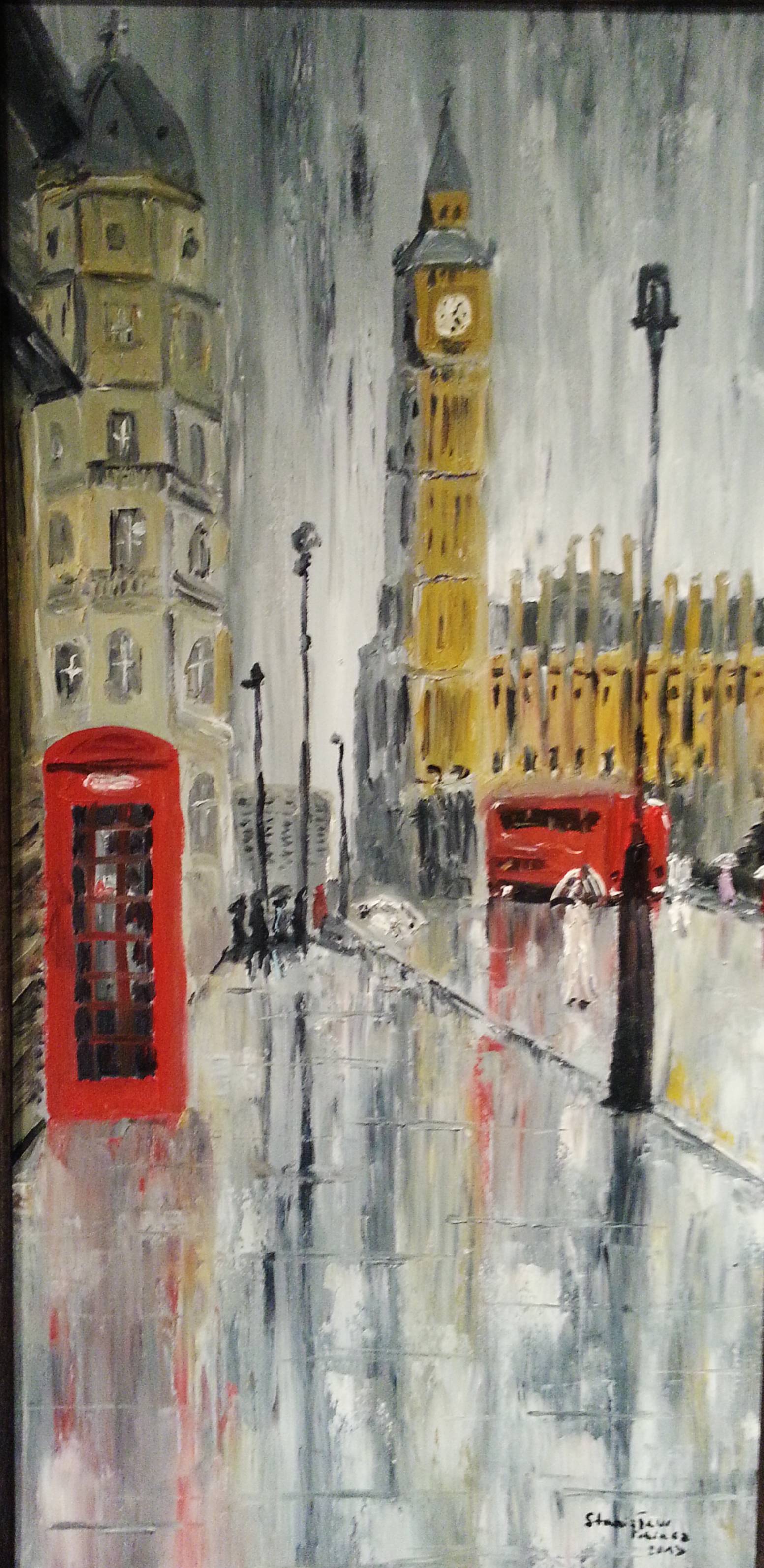 Obraz przedstawia deszczowy dzień w Londynie z jego ikonicznymi elementami. Dominują stonowane odcienie szarości, przetykane żywą czerwienią telefonicznej budki i charakterystycznego autobusu. Niby zwykły widok, ale przyciąga wzrok. Budynki w tle, w tym znana wieża zegarowa, nadają scenie historycznego klimatu. Deszcz delikatnie rozmywa kontury, tworząc efekt rozmytej rzeczywistości. Atmosfera jest melancholijna i nieco nostalgiczna, jak wspomnienie spoglądające z przeszłości. Artysta zastosował technikę impasto, pozwalając farbie tworzyć fakturę na płótnie. To dodaje głębi obrazu, dając poczucie ruchu i dynamiki. Obraz jakby zapraszał do zanurzenia się w tej miejskiej przestrzeni, gdzie każdy szczegół mówi o codziennym życiu miasta. Patrząc na niego, można poczuć tęsknotę za podróżami i odkrywaniem. "Rainy days," przychodzą na myśl. Myśli odbiorcy biegną w stronę spokojnego spaceru pod parasolem. Obraz emanuje ciepłem pomimo szarych tonów. Jakby mówił: Londyn zawsze zachwyci. Mógłbym tu stać godzinami, wsłuchując się w szum deszczu. Dla dzieciaka: To wygląda jak miasto z bajki z wielkim zegarem! Przeplatają się tu emocje, a każdy widz wprowadza swoje własne refleksje. To nie tylko obraz, to mała wędrówka do serca Londynu.