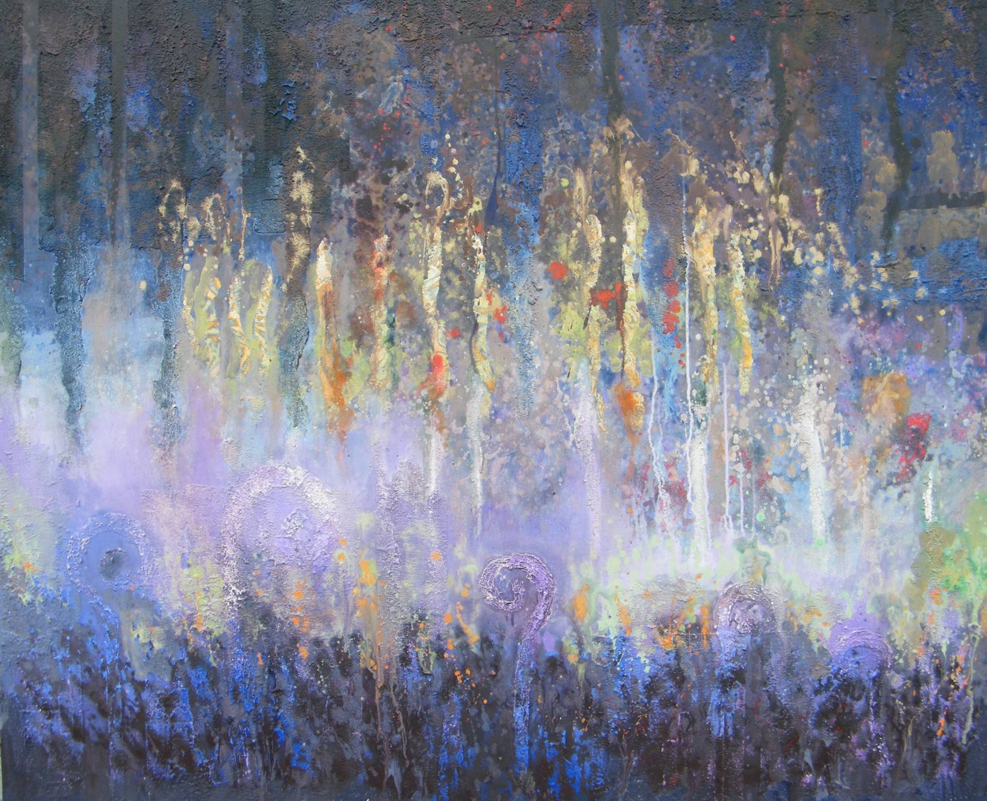 Obraz emanuje magiczną aurą tajemnicy, jakbyśmy spojrzeli przez mgłę na zaczarowany las pełen migotliwych światełek. Z przewagą zimnych, ale i żywych, pastelowych kolorów jak niebieski, fiolet i subtelne zielenie. Te barwy zlewają się w delikatne kształty, przypominając niezgrabne sylwetki drzew unoszące się we mgle. Światło zdaje się przechodzić przez kompozycję, rzucając blask tu i ówdzie, niczym malowane impresjonistyczną ręką, trochę messy ale intrygująco piękne. Artysta posłużył się techniką, gdzie tekstura farby nadaje dodatkowej głębi dziełu. Patrząc na ten obraz można prawie poczuć chłód poranka. Coś w tym obrazie przypomina mi smaki dzieciństwa, kiedy wydawało się, że na świecie wszystko jest możliwe. Atmosfera jest o dziwo spokojna, a zarazem pełna dynamicznych ruchów, jakby natura miała swoje hidden secrets. Kiedy na niego patrzę, czuję nostalgiczne wzruszenie, jakby przypominał mi coś, acz nie wiadomo co. Wiem jedno, dzieła takie jak te, sprawiają, że uśmiech pojawia się na mojej twarzy. To takie magiczne, że aż trudno się nie uśmiechnąć!