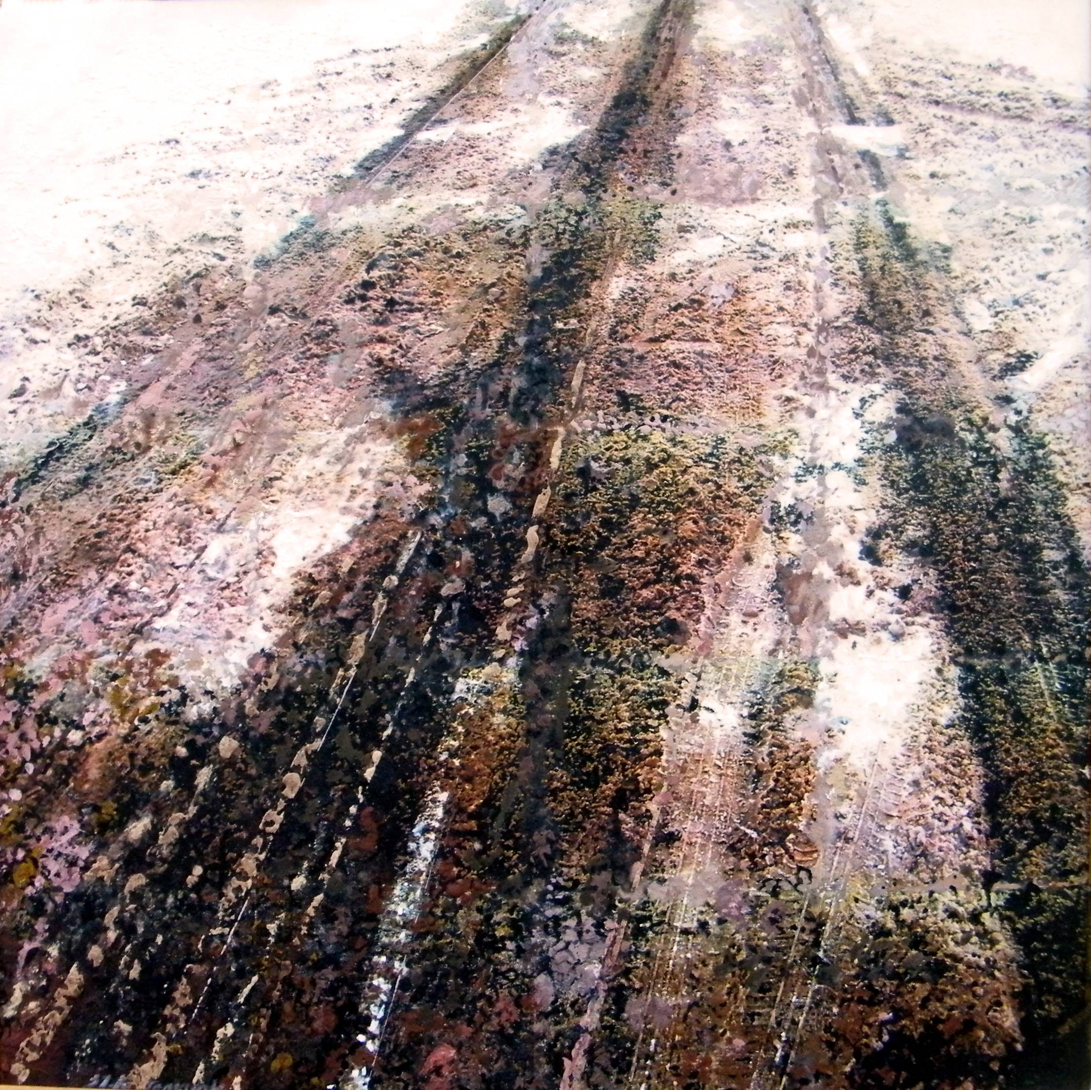 Obraz przedstawia rozległy krajobraz, gdzie ziemia jest poryta śladami kół, tworząc dynamiczne linie ciągnące się aż po horyzont. Dominują brązy, ochra i zielenie, które nadają całości surowy, lecz jednocześnie ziemisty charakter. Kompozycja jest mocno linearna, przyciąga wzrok w dal. Atmosfera dzieła jest melancholijna, może nawet nieco nostalgicza. Czuć tu ciszę pustkowia, które pamięta ślady przeszłości. Artysta użył techniki, która przypomina impast, z wyraźnie nałożonymi warstwami farby, co dodaje tekstury. Wyobraźnia podpowiada, że to miejsce opowiada swoje własne historie, wystarczy chwilę się zatrzymać i posłuchać. Emocje, jakie obraz budzi, to refleksja nad przemijaniem i śladami, jakie pozostawiamy. Całość jest melancholiczna, ale równocześnie tajemnicza. Ta kolorowa mozaika przypomina czasem zupełnie inny world, takie jest zaskakujące. Dla dziecka to mogłaby być wielka niekończąca się droga, którą można biec aż do końca świata. Obraz porusza niby spokojnie, ale gdzieś w środku coś drży.