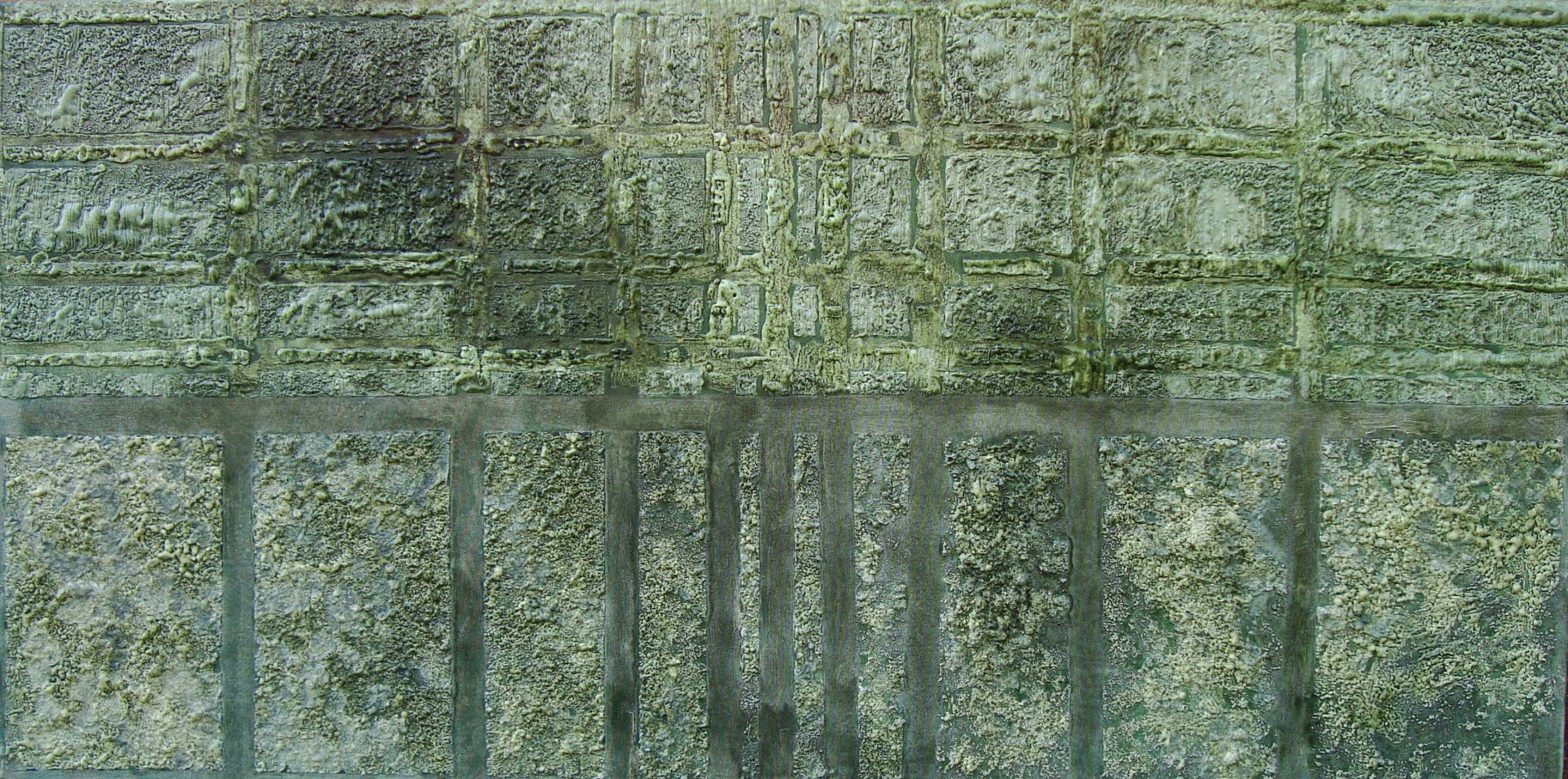 Obraz przedstawia fascynującą kompozycję tekstur i odcieni zieleni oraz szarości. Wygląda jak mozaika złożona z nierównych prostokątów, gdzie ich chropowata powierzchnia zdaje się opowiadać jakąś historię. Kolory przechodzą płynnie od jasnych do ciemnych tonów, tworząc efekt głębi i tajemnicy. Całość wygląda bardzo surowo i przypomina coś z natury, jakby skała czy stara ściana o ciekawym wzorze. Czy to widać? Pewnie to jakiś magiczny mur z zamku. Nastrój obrazu jest spokojny, ale jednocześnie ciekawi i zachęca do odkrycia jego tajemnicy. Artystyczny styl opiera się na abstrakcyjnych wzorach i technikach fakturowania, które nadają obrazowi wyjątkową strukturę. To jest naprawdę awesome! Użycie różnych grubości farby i prawdopodobnie szpachli dodaje mu dynamiki, choć na pierwszy rzut oka wszystko wydaje się bardzo statyczne. Odbiorca może poczuć pewną nostalgię, jakby ten obraz przypominał mu jakieś zapomniane miejsce. Jednocześnie zachęca do zastanowienia się, co kryje się za tym tajemniczym wzorem. O tak, to jakby patrzeć przez okno do innego świata. Fascynujące i trochę zagadkowe, prawda?