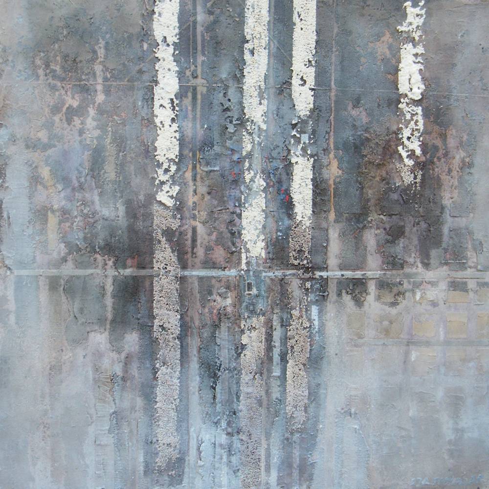 Na obrazie dominują zimne odcienie szarości i bieli, które tworzą surową, niemal industrialną atmosferę. Kształty są niejednolite, przypominające pionowe pasy pękającej farby na ścianie. Kompozycja jest zaskakująca, bo mimo swojej prostoty przyciąga wzrok jak magnes. Nad całością unosi się lekka mgiełka tajemnicy, tworząc nastrój pełen zadumy i pewnego rodzaju melancholii. Artysta zastosował techniki mieszania farb i tekstur, co dodaje dziełu głębokości i struktury. Czuję, że praca balansuje między abstrakcją a czymś namacalnym, a każdy detal opowiada swoją własną story. Dla mnie to cudowne, jak każdy może po swojemu interpretować tę sztukę. Może ktoś zobaczy tu fragment swojego świata albo kawałek dzieciństwa. It's intriguing, isn't it? Ktoś powie, że to tylko farba na płótnie, ale dla mnie to więcej. Czasem mam ochotę dotknąć tej powierzchni, żeby poczuć na palcach chropowatą złudę kamienia. To, jak artysta operuje przestrzenią i materię, pokazuje, jak prawdziwe emocje mogą być zaklęte w prostych formach. A ja bym powiedział, że to obraz, na którym można się skupić, kiedy jest się smutnym i trzeba jakiegoś otuchy.