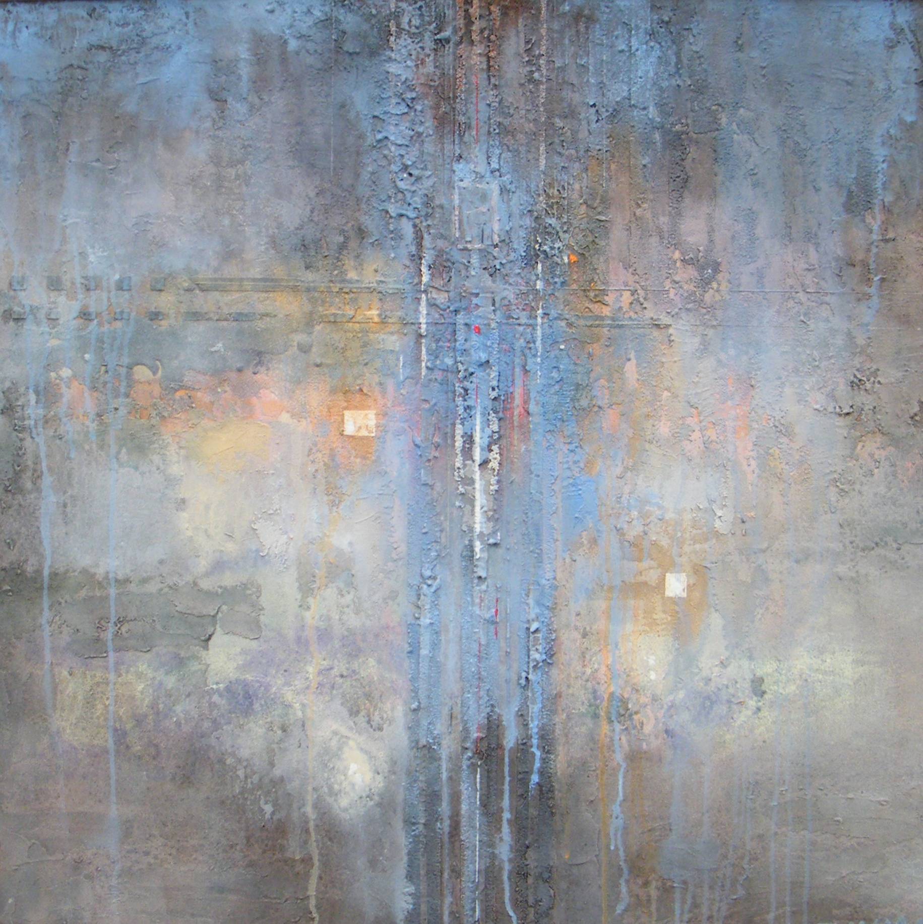 Obraz eksploduje feerią zimowych kolorów. Dominuje błękit, przenikający się z szarością i subtelnymi akcentami ciepłego beżu. Kiedy patrzysz, widzisz, że przypomina mglisty poranek, kiedy wszystko jest w ciszy, a powietrze zdaje się wisieć w oczekiwaniu. Kompozycja jest pełna pionowych smug, niczym krople deszczu spływające po szybie. Mrugnięcie oka i czujesz, że to odrobina melancholii z domieszką nadziei. Coś jak nostalgia za pięknym dniem, który dopiero nadejdzie. Artysta, w swojej technice, stosuje grubą fakturę. Widać tu impast, coś jakby sztuka miała swój ciężar, swoją materialność. Różne warstwy barw i faktur tworzą głębię, która wciąga. Ścisłe spojrzenie ujawnia, że obraz emanuje spokojem, ale i pewnym rodzajem intensywności. Jakby kolory chciały coś powiedzieć, może coś pocieszyć. Obraz może budzić różne emocje. Może to być tęsknota za miejscem, które nigdy nie istniało, ale też spokój, gdy wszystko wokół szumi. Dziecko powiedziałoby: "To chmury w deszczowy dzień!". Jedno spojrzenie budzi refleksje na temat przemijania i tego, co ulotne. Nagle czujesz, że obraz szepcze „tranquility” - tak, ta spokój i głęboka cisza, która jest pełna niewypowiedzianych słów.