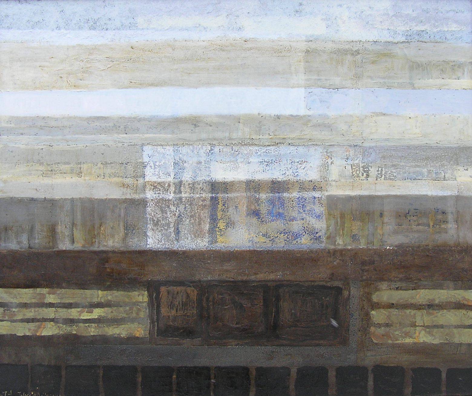 Obraz emanuje subtelnymi tonami, dominując w odcieniach błękitu, szarości i beżu. Są one rozmyte, tworząc przyjemne dla oka przejścia między pasmami kolorów, które układają się poziomie jak spokojne fale na jeziorze. Kompozycja jest trochę jak pejzaż, ale nie do końca. Ma w sobie coś ulotnego, nieuchwytnego, co sprawia, że wpatrujemy się w nią z ciekawością. Wygląda na to, że artysta zastosował techniki mieszane, łącząc różne tekstury i warstwy farby. Można tutaj dostrzec delikatne, niemal impresjonistyczne pociągnięcia pędzla. Obraz przywodzi na myśl momenty zawieszenia w czasie, chwilę tuż przed burzą, kiedy wszystko wydaje się zatrzymane w napięciu. Wow! Ale ciekawe kolory! To dzieło może wywołać w odbiorcy uczucie spokojnej kontemplacji, ale też lekkiego niepokoju. Może sugerować różne historie, różne emocje, od łagodnego smutku po nostalgiczne wspomnienia. A wszystko to w atmosferze dreamy, marzycielskiej, którą trudno jest opisać słowami. Jest w tym obrazie coś przyciągającego, co sprawia, że trudno od niego oderwać wzrok.