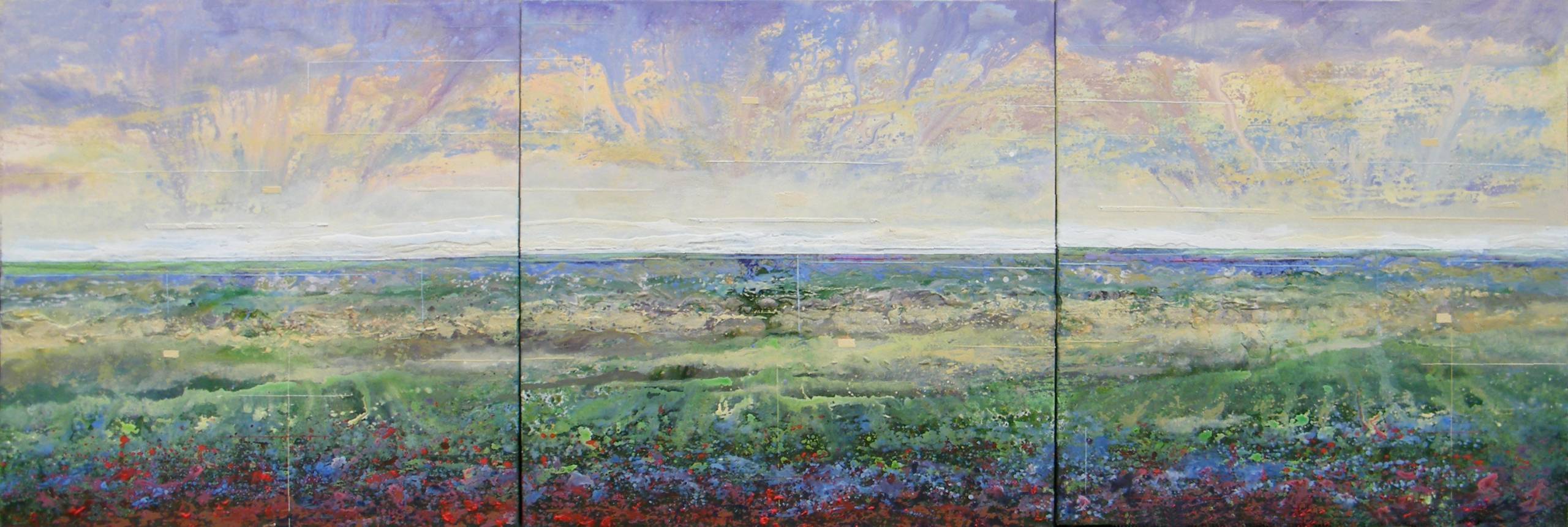 Obraz przedstawia rozległy krajobraz, który wręcz hipnotyzuje swoją kolorystyką i kompozycją. Dominują tu subtelne odcienie niebieskiego, zieleni oraz nuty fioletu, które płynnie łączą się z pastelowymi barwami nieba. Kompozycja zdaje się dzielić przestrzeń na dwie części - ziemię z bujną roślinnością na dole oraz delikatne, eteryczne niebo powyżej. Powstaje wrażenie spokoju, jakby czas zwolnił, a świat zasnęły mgłą marzeń. Artysta posłużył się technikami mieszania farb, które nadają dziełu dynamizm i teksturę. Pociągnięcia pędzlem są szybkie, lecz precyzyjne. Obraz przypomina mi ilustracje z książek o krainach fantasy. Z bliska, widzimy wiele szczegółów składających się na ledwie dostrzegalną iluzję głębi, która przyciąga wzrok. Uczucie, które emanuje z obrazu, to nostalgia. Jakbyśmy zatęsknili za miejscem, w którym nigdy nie byliśmy. Dzieciak powiedziałby: Czuję, że mogę tam pobiec! I trudno się dziwić. Atmosfera jest dreamlike, niemal magiczna, co skłania do refleksji nad urodą naszej planety. Ten obraz zaprasza do zanurzenia się w chwili, do złapania oddechu pośród zielonych pól i pod monumentalnym niebem. I to jest piękne.
