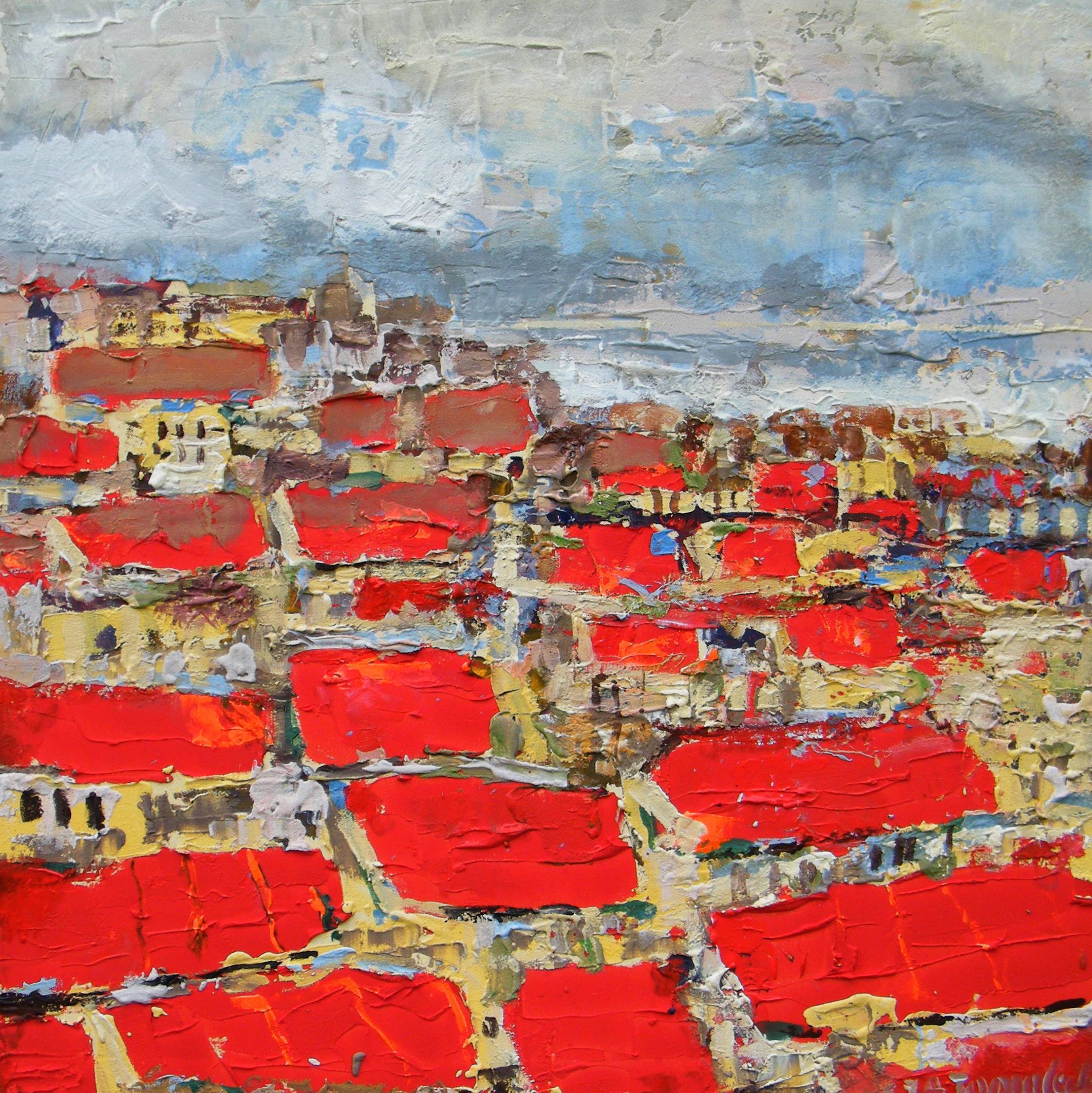 Obraz tętni kolorami, a dominujące czerwienie dachów przykuwają wzrok. Pędzle artysty zatańczyły tu w ekscytującym rytmie, tworząc miasto pełne życia i energii. Krajobraz miasta rozciąga się pod ciężkimi, szarymi chmurami, które dodają nutkę dramatyzmu. Czerwone dachy układają się w geometryczną mozaikę, kontrastując z chłodnym błękitem nieba. Artysta użył impasto, nadając teksturze niepowtarzalny feel. Grube warstwy farby, nałożone z rozmachem i pasją, nadają dziełu dynamiczny charakter, niemal słyszy się stukot deszczu o dach. Obraz emanuje pewnym spokojem, jakby mówił "patrz na mnie, odkryj moje tajemnice". Czuje się codzienność miejskiego życia, pulsującą pod tym czerwonym kobiercem. Technika zastosowana przez artystę tworzy strukturę, która budzi zainteresowanie. Coś jak radość po zobaczeniu czegoś nowego. Patrząc na to, można pomyśleć o podróży do Włoch czy Hiszpanii, gdzie taki widok byłby normą. Nie możesz się oprzeć wrażeniu, że artysta bawił się kolorami, jak dziecko kredkami. Wow, chciałbym tam być! Intuicyjne użycie koloru sprawia, że odbiorca czuje się częścią tej miejskiej opowieści. Kolory działają jak magnes, przyciągając nasze spojrzenia i skłaniając do dalszej refleksji. Czysta dynamika codziennego życia zamknięta w ramach pełnych barw i tekstur. Artystyczne masterpiece tej spokojnej sceny wciąga nas w swoją historię.