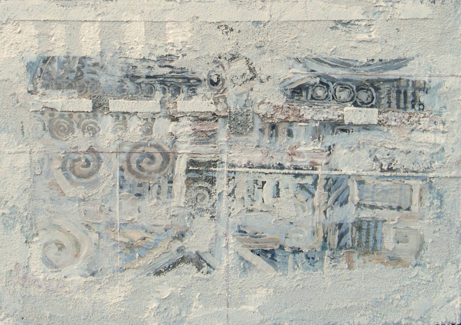 Obraz, który widzimy, to prawdziwa uczta dla oka. Dominuje w nim chłodna paleta barw - błękity, szarości i biel, przypominające mroźny zimowy krajobraz. Kompozycja jest abstrakcyjna, z zawirowaniami przypominającymi spirale i prostokąty, które zdają się chaotycznie tanczyć na powierzchni. Artysta użył techniki impasto, dzięki której farba tworzy trójwymiarowe faktury, a całość zyskuje niezwykłą głębię i dynamikę. Atmosfera obrazu jest spokojna, ale i tajemnicza - jakby coś istotnego ukrywało się pod warstwami farby. Styl jest luźny, przypominający street art, gdzie przypadek odgrywa kluczową rolę. Przyciąga uwagę dzięki swojej prostocie, a jednocześnie mnogości detali, które można odkrywać godzinami. Działo to wywołuje różnorodne emocje. Dla jednych to przygnębiająca nostalgia, dla innych zachwyt nad pięknem chaosu. Dzieciak by powiedział: "To wygląda jak zamrożone malunki z bajki!" Całość może wydawać się nieco enigmatyczna, ale to właśnie jej urok. Dla mnie to przypomina stare mury, na których czas odcisnął swoje piętno. Wow, it's amazing!