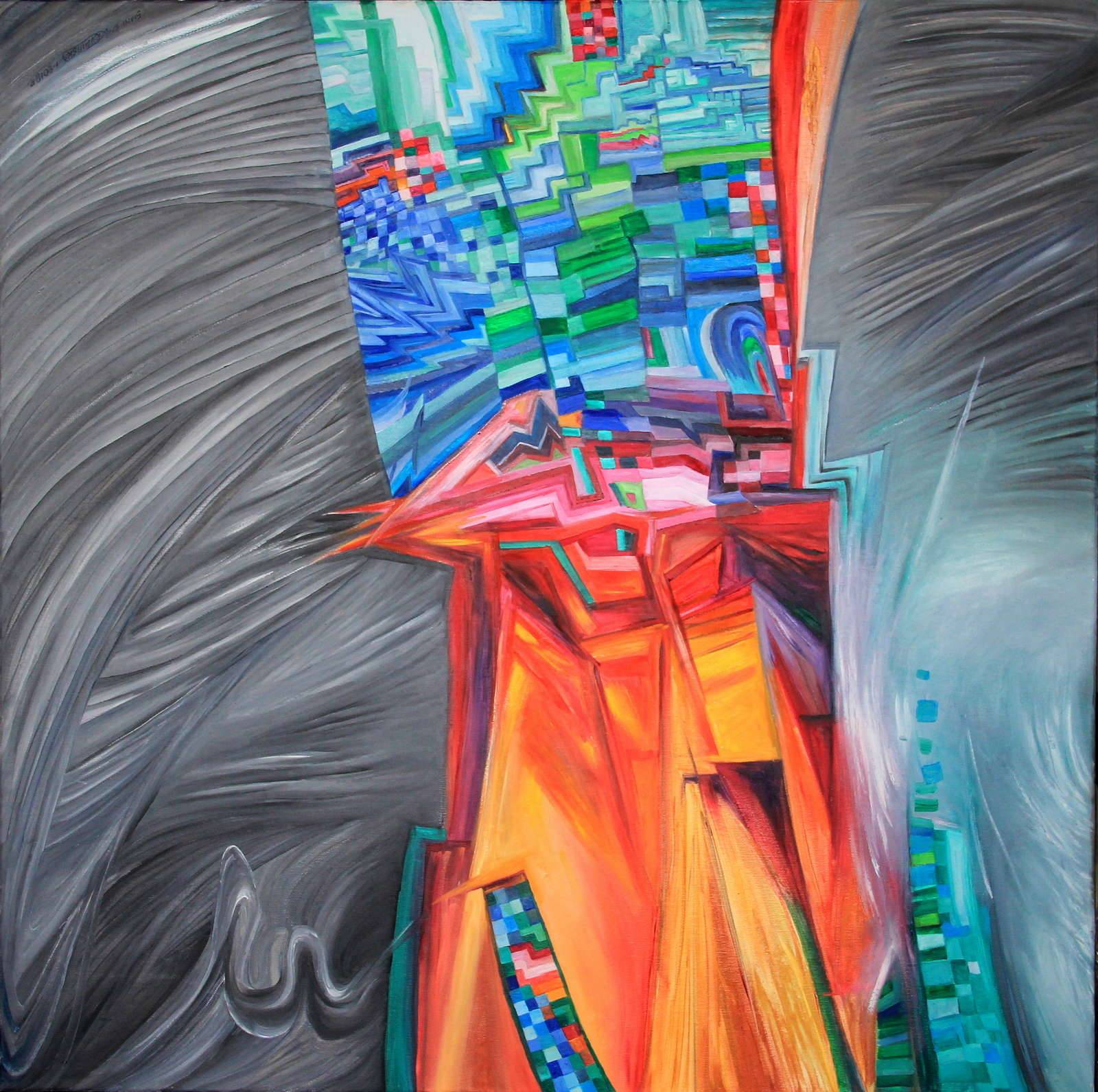 Obraz zachwyca feerią kolorów i geometrycznych kształtów. Centralna część eksploduje wiązką barw—pomarańcze, czerwienie i błękity konkurują ze sobą, tworząc dynamiczną mozaikę. Po bokach, spokojne szarości i zielenie otaczają serce kompozycji, jakby próbując ją okiełznać. Artysta korzysta z techniki impasto, umożliwiającej tworzenie wyrazistych tekstur, które niemal wychodzą z płótna. To dzieło niesie poczucie energii i ruchu—jest jak muzyka w pełnym rozkwicie. Patrzący może poczuć lekki niepokój czy może nostalgii, bo te barwy przypominają o czymś, co już było, a już może nie wróci. Look at those colors, you'd think it's an explosion of emotions. Dzieło emanuje nowoczesnością, jednocześnie sięgając po elementy klasycznego malarstwa abstrakcyjnego. Mnie się to wszystko kojarzy z podróżą w kosmos, taką kolorową i szaloną. Każdy odbiorca znajdzie tu coś dla siebie, emocje mogą oscylować od zachwytu, przez refleksję, aż po zadumę nad chaosem współczesnego świata. Oj, to trochę jak krajobraz snu, który raz widziany, na długo zostaje w pamięci.