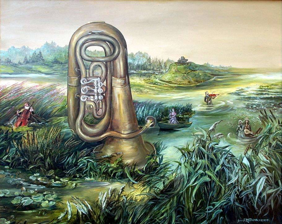 Na obrazie widzimy malowniczy, surrealistyczny krajobraz. Monumentalna tuba, niemal żyjąca, dominuje scenerię, wyrastając spośród falujących traw, zielsk i wirujących wód rzeki. Jej miedziane krzywizny odbijają subtelne refleksy światła. Całość otoczona jest stonowanymi zieleniami, pastelowymi błękitami i złotymi odcieniami, które tworzą harmonijną kompozycję. W oddali, skąpani w słońcu, widzimy artystów zatopionych w swojej muzycznej pasji - skrzypka w wodzie i wiolonczelistkę na brzegu. Nastrój jest oniryczny, niemal senny, a jednocześnie emanuje ciepłem i spokojem. Obraz wywołuje poczucie cudownej harmonii, ukazując idealne współistnienie natury i dźwięku. Technika malowania zrównoważona, z miękkimi, płynnymi pociągnięciami pędzla. "Wow, jaki duży instrument!" - mogłoby powiedzieć dziecko. Odbiorca może poczuć się jak w bajce, pełnej magicznych brzmień, gdzie czas płynie inaczej. To prawdziwy przykład "masterpiece" sztuki surrealistycznej.