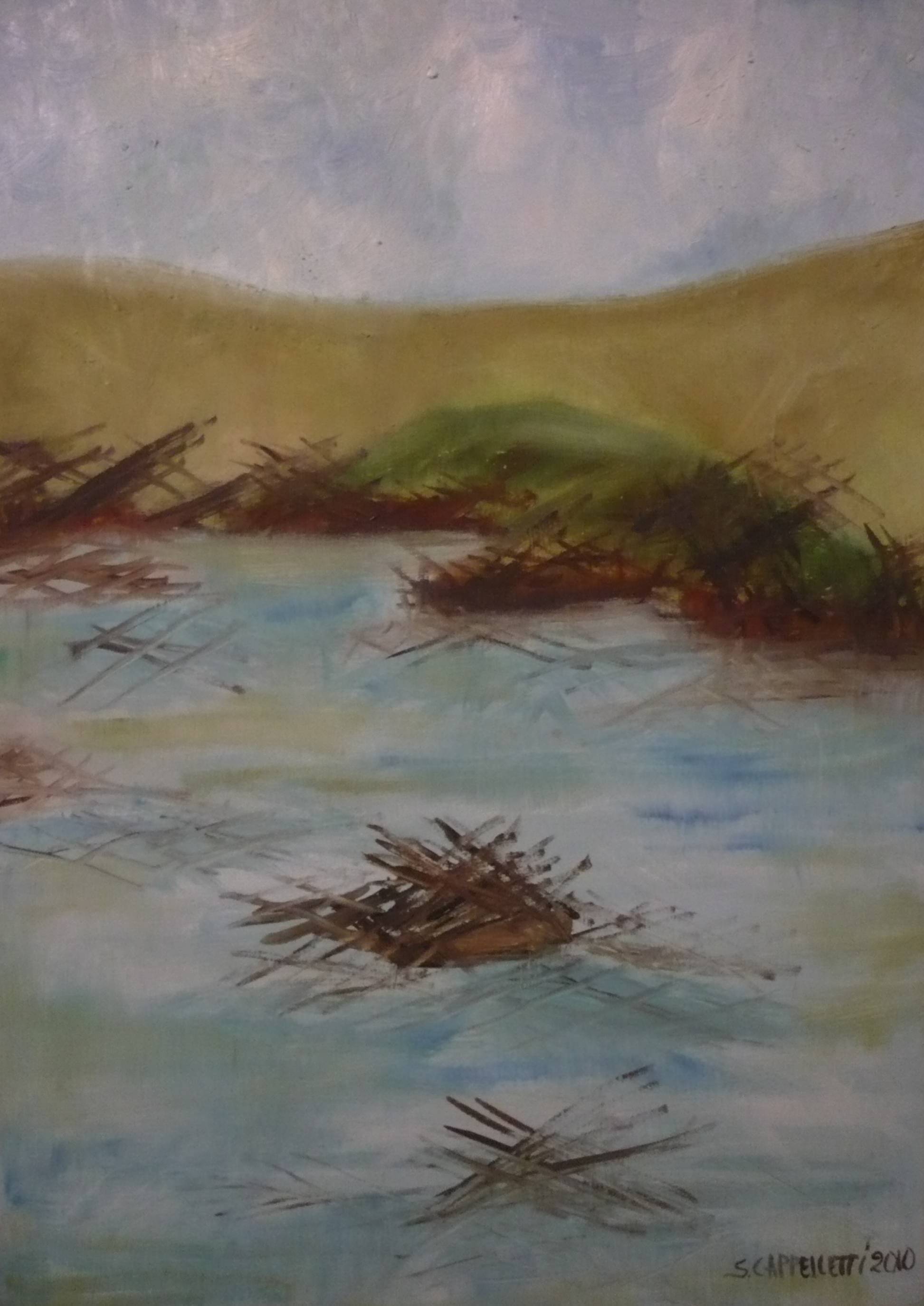 Obraz urzeka prostotą i pastelowymi kolorami, które wciągają jak niebo o świcie. Dominują zielenie i błękity, przeplatane brązowymi akcentami, tworząc harmonię z uroczym zamgleniem w tle. Kompozycja opiera się na płynnych, delikatnych liniach, które przecinają powierzchnię wody, sugerując subtelny ruch — jakby wiatr lekko smagał trzciny nad stawem. Atmosfera obrazu jest nostalgiczna, jak wspomnienie wakacji nad jeziorem. Artysta zastosował miękkie pociągnięcia pędzlem, nadając dziełu impresjonistyczny charakter, pozwalający obudzić się emocjom. To nie jest zwykła scena przyrody; jest magiczna. Sprawia, że czujesz się spokojniejszy. Czy ktoś kiedyś czuł się podobnie? Wiesz, obraz przypomina mi chwile, kiedy byłem małym dzieckiem i biegałem po polach. Mamo, jak tu pięknie! Ciepło bijące z płótna wpływa na nasze postrzeganie rzeczywistości, zapraszając do introspekcji. Artwork catch the stillness moment, w którym zatrzymuje się czas, a nasze uczucia unoszą się na powierzchni delikatnego strumyka. Wciąga i pozwala zatracić się w jego nieuchwytnej aurze, łagodząc każde smutki.