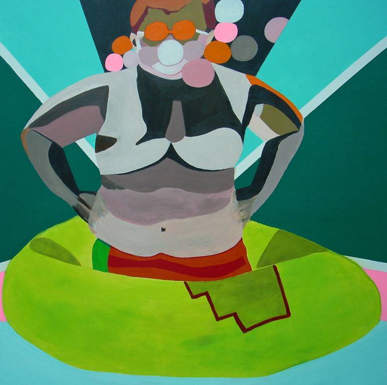 Ten obraz to prawdziwa eksplozja kolorów i form. Dominują żywe barwy: zieleń, turkus, pomarańcz i róż, które tworzą dynamiczną kompozycję. Centralna postać, o geometrycznych kształtach, zanurzona jest w neonowym zielonym kole, jakby szykowała się na wakacyjne splash. Otaczają ją koliste, pastelowe formy, które mogą przypominać bańki czy dmuchawce – dodaje to całości nutki beztroski. Atmosfera jest przyjemnie zabawna, wręcz figlarna, jakbyśmy byli świadkami chwili pełnej radości. Artysta używa tu prostych technik – płaskie plamy barw i wyraźne kontury przywodzą na myśl nowoczesny pop-art. Wzbudza to u mnie takie uczucie, jakbym znów poczuł się jak dziecko na wakacjach. Hey, that's fun! Patrząc na tę scenę, można myśleć o beztrosce i letnim wypoczynku, o chwilach, kiedy słońce świeci mocno, a czas płynie wolniej. Ale zaraz, czy to jest bańka mydlana? Myślę, że artysta chciał przypomnieć, jak ważne jest cieszenie się chwilą, mimo prostoty dnia codziennego. Patrząc na te soczyste kolory, czuję jak energia płynie niemal bezpośrednio do mojego serca.