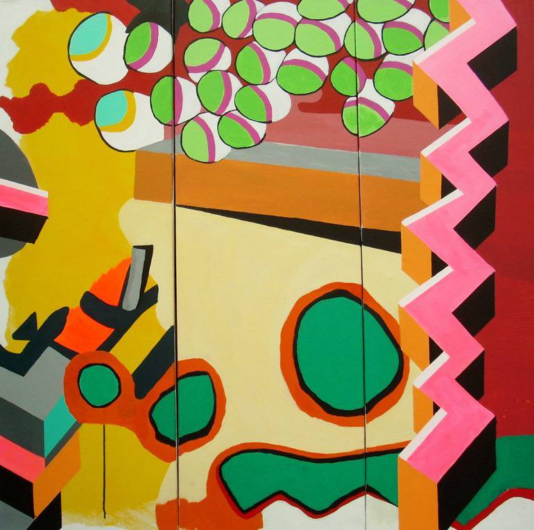 Obraz jest jak wybuch kolorów, pełen zieleni, różu, czerwieni i żółci, które wibrują na płótnie. Kompozycja jest dynamiczna i chaotyczna, pełna okrągłych kształtów i prostych linii, które zdają się tańczyć między sobą. W tle dominują jasne, nasycone kolory, tworząc tło dla wyrazistych, geometrycznych form. Atmosfera jest radosna i pełna energii, jakby ktoś chciał zamknąć w obrazie całą paletę emocji. Styl artystyczny przywodzi na myśl pop-art, z wyraźnymi konturami i odważnym użyciem barw. Technika, której użył artysta, jest jakby niedbała, ale jednocześnie precyzyjna. Obraz może wywoływać w widzu uczucie pozytywnej dezorientacji, jest jak "colorful chaos", który cieszy oko. Patrząc na te formy, człowiek może myśleć o dynamice miejskiego życia lub energii młodych umysłów. Trochę przypomina to widok z kalejdoskopu, gdzie wszystko się miesza i tworzy coś nowego z każdą chwilą. Może dzieciak by powiedział: "To wygląda jak duża kolorowa pizza!" Te wszystkie emocje, zaskoczenie i zachwyt, składają się na osobistą podróż przez wyobraźnię artysty, który odważnie igra z konwencjami i bawi się estetyką.