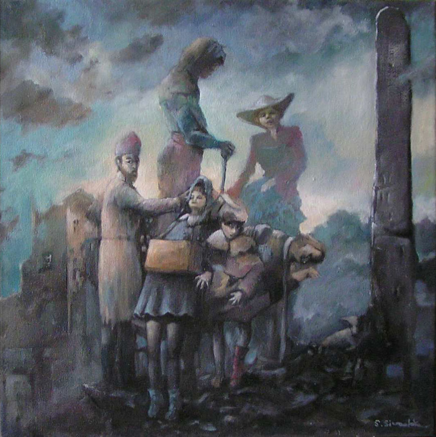 Obraz przedstawia grupę postaci o wyrazistych konturach na tle niejasno zdefiniowanego, pochmurnego nieba. Kolory są stonowane, dominują szarości i niebieskości, z odrobiną brązów i różu. Postaci stoją w dziwnie teatralnych pozach, jakby pochodziły z innej epoki czy snu. Kompozycja jest zwarta, postaci są blisko siebie, co może sugerować wspólnotę lub izolację od otoczenia. Artysta zastosował technikę malarską, która łączy detale z surrealistycznymi efektami – to takie dreamlike w swojej esencji. Patrząc na ten obraz, można poczuć mieszankę nostalgii i niepewności. Nasuwają się pytania – kim są ci ludzie, dlaczego tu są? Praca ta może budzić refleksje nad przemijaniem, samotnością, a może tęsknotą za lepszym światem. Coś magicznego w tej scenerii przyciąga wzrok i nie pozwala przejść obojętnie. Patrząc na to dzieło, człowiek czuje, że sztuka potrafi mówić tysiącem języków, z których każdy odkrywa coś innego.