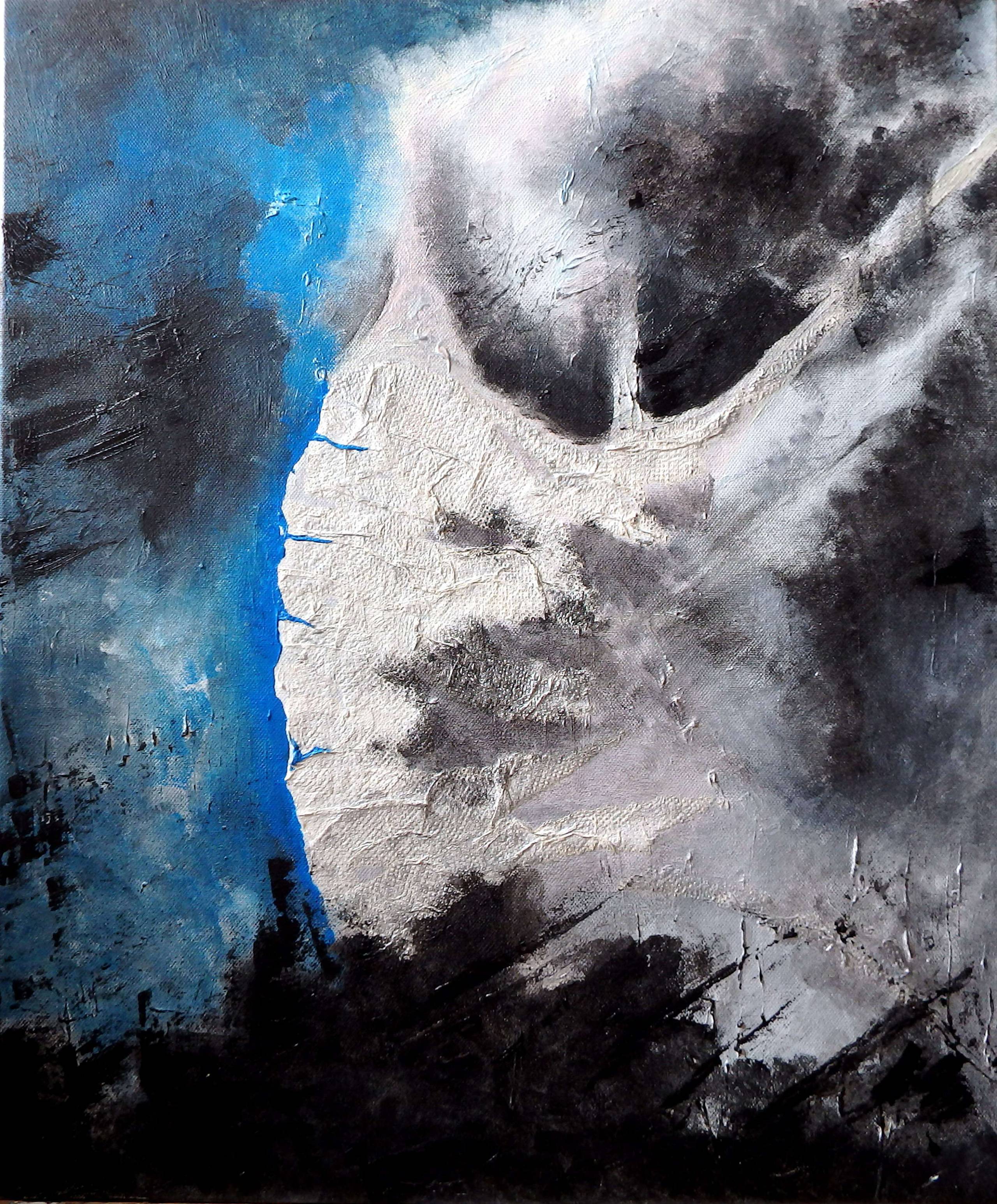 Obraz zasadniczo wykonany farbą akrylową jednak z elementem faktury papierowej.