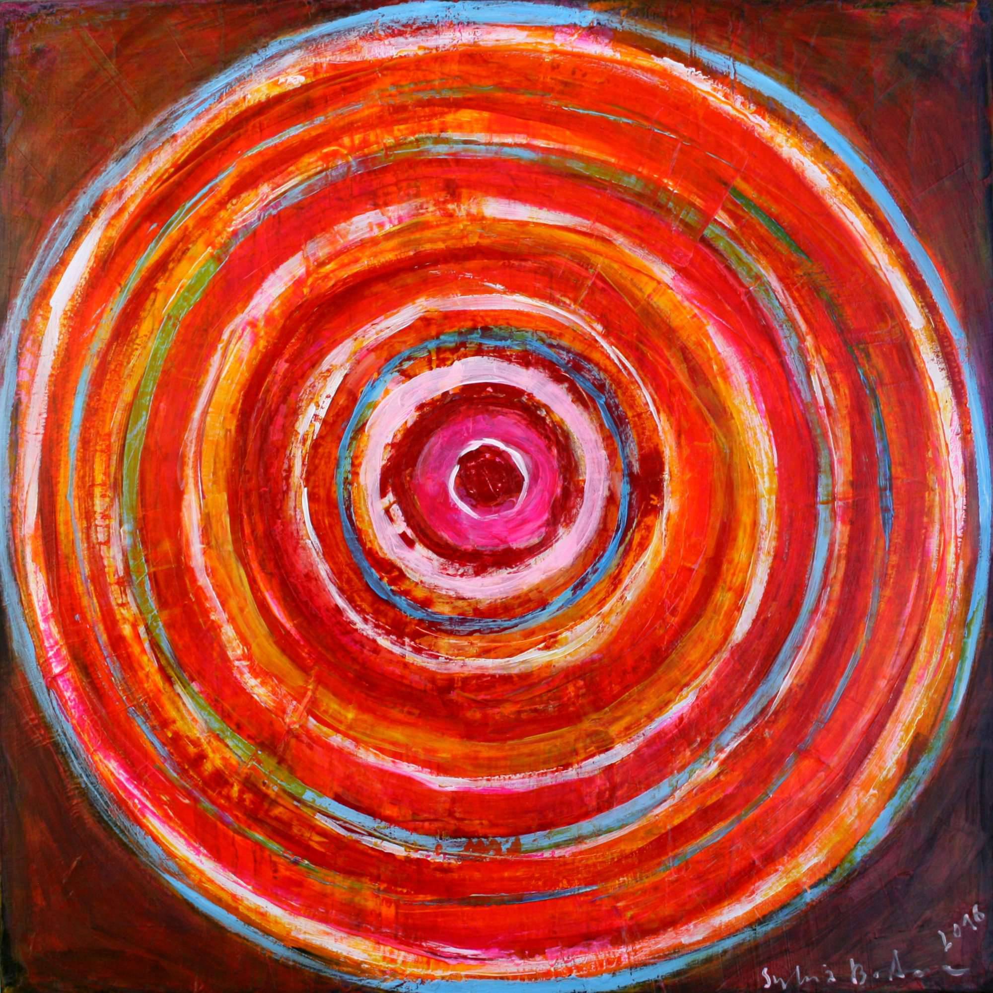 Ten obraz to eksplozja koloru. Koncentryczne kręgi w różnych odcieniach czerwieni, pomarańczu i różu tworzą wrażenie ruchu, jak gdyby obraz mógł się kręcić, gdy na niego patrzymy. Centralne okręgi przyciągają wzrok, jakby były źródłem energii. Trudno oderwać oczy! Nastrój dzieła jest dynamiczny. Intensywność kolorów sprawia, że widz czuje się ożywiony, niemal jak po solidnej dawce kawy. Można wręcz poczuć, jak obraz wibruje, tętni życiem. Takie "synergy" kolorów i kształtów przenosi odbiorcę w świat emocji i wewnętrznego zgiełku. Technika przypomina nieco abstrakcję ekspresjonistyczną. Artysta bawi się barwami i fakturą, tworząc efekt, który jest zarazem dziki i precyzyjny. Grube pociągnięcia pędzla tworzą teksturę, która dodaje trójwymiarowości. Mój kot mógłby to namalować - pomyśli ktoś z humorem. Można poczuć radość, ale i niepokój. Ten obraz mówi o chaosie życia i o jego nieskończonej energii. Wywołuje refleksję, zadaje pytania o to, co jest najważniejsze. Może chodzi o tę magię chwili. Sam nie wiem, ale chciałbym go mieć na ścianie.