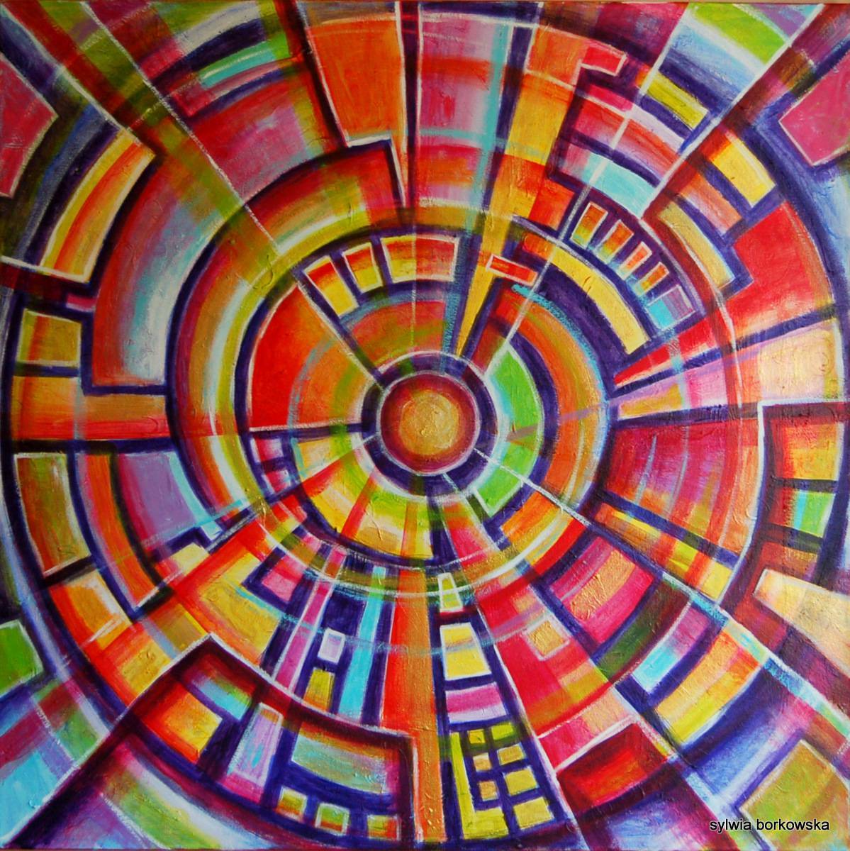 Obraz tętni życiem i dynamiką dzięki intensywnym kolorom. Paleta obejmuje ciepłe odcienie czerwieni, pomarańczu, żółci oraz chłodne akcenty niebieskiego i fioletu. Kolorowy wir koncentrycznych kół i prostokątów tworzy kompozycję pełną energii. Każda linia zdaje się opowiadać osobną historię. Wygląda jak labirynt pełen tajemnic. Nastrój obrazu jest pełen ekscytacji i pozytywnej energii, jak wieczorna impreza w centrum miasta. Technika użyta przez artystę przypomina styl kubistyczny, z elementami abstrakcji. Grube pociągnięcia pędzla nadają trójwymiarowej dynamiki. Obraz może wywołać u widza poczucie zachwytu lub chaosu. Dla siedmiolatka: To wygląda jak kolorowe wesołe miasteczko! Sam czuję się, jakbym chciał wejść do środka i się bawić. Wow, jakie to wszystko bright i zaskakujące. Artysta z pewnością pragnął uzyskać efekt zaskoczenia, grając kolorami i kształtami, jakby były elementami magicznej układanki.