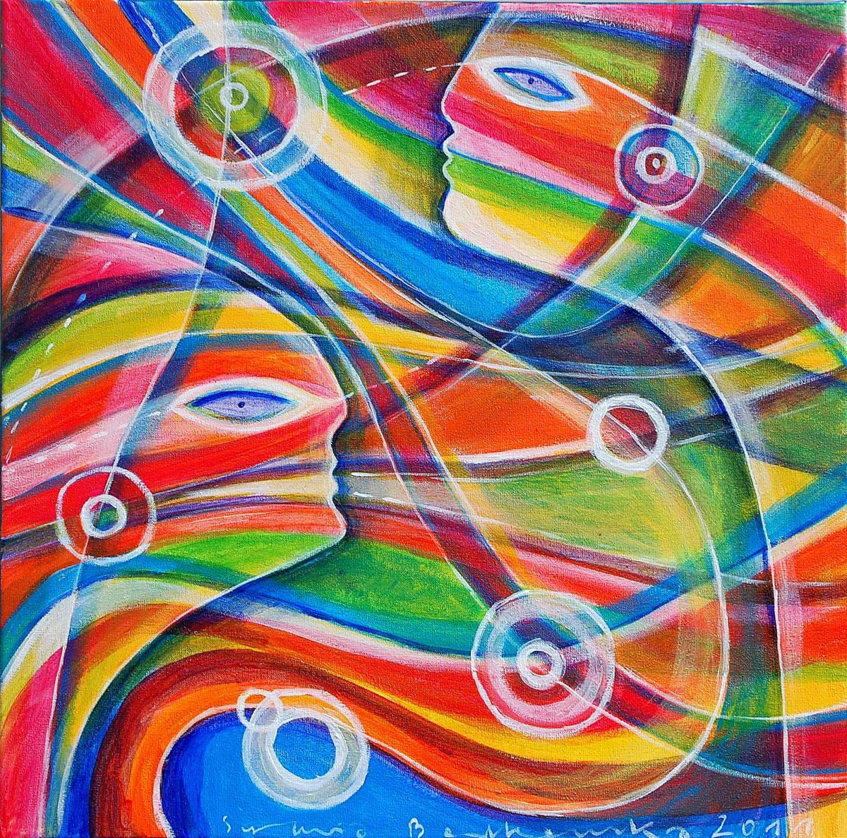 Na obrazie wiruje tęczowa feeria barw, splatająca się w zawiłe wzory i kształty. Przenikają się tu intensywne odcienie czerwieni, żółci i błękitu, tworząc kalejdoskopowy efekt, który przyciąga wzrok. Dwie enigmatyczne postacie z profilu zdają się dyskutować lub zamyślać, ich sylwetki układają się w delikatne linie, przypominające fale płynące po powierzchni. Tłem wibruje energia, jakby wszystko wokół żyło własnym życiem. Całość emanuje dynamiczną atmosferą, jakby obraz chciał pokazać jedność różnorakich emocji. Czuję się, jakbym był na skraju wybuchu, ale w pozytywnym, pełnym nadziei sensie. Artysta zastosował technikę mocnych, pewnych pociągnięć pędzla, mieszając style abstrakcji i ekspresjonizmu. Look! To jak podróż w nieznane, w głąb własnych myśli. Obraz może wzbudzać w odbiorcy zarówno radość, jak i poczucie zagubienia. Chciałbym, żeby życie zawsze było tak kolorowe. Wywołuje we mnie refleksje nad tym, jak różnorodność może tworzyć harmonię. Może przypominać kalejdoskop, w którym każdy element jest niepowtarzalny, a jednak idealnie współgra z innymi. To jak zabawa w wyobraźnię i odkrywanie skrytych emocji ukrytych w plątaninie barw. Co ciekawe, każdy patrząc na ten obraz może dostrzec coś innego, coś, co w nim rezonuje.