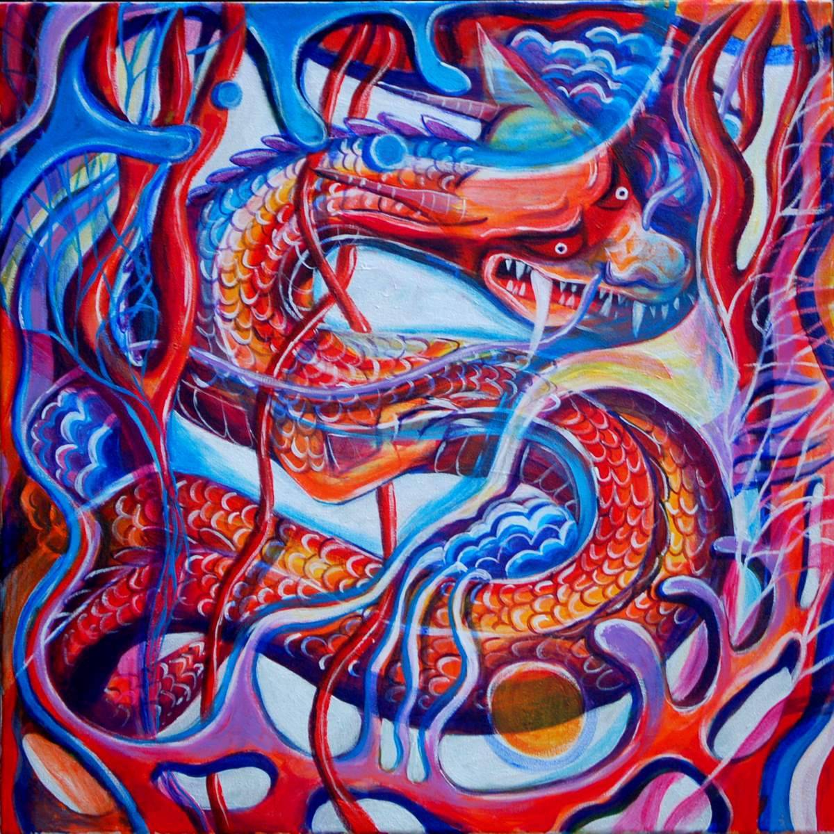 Obraz pełen życia i ruchu, eksplodujący feerią kolorów: czerwieni, fioletów i błękitów, które dominują w kompozycji. Strukturalne linie i łuki tworzą zawiłą siatkę, w której ukryty smok spogląda z energicznym wyrazem. Wygląda, jakby zaraz miał wyjść z płótna. Kształty abstrakcyjne mieszają się z detalami, tworząc dynamiczną i krzykliwą atmosferę. Styl artystyczny przyciąga oko żywiołowością i pewną surowością, trochę jak street art w wersji canvas. Techniki nakładania warstw farby i wyraziste kontury nadają kompozycji głębi. Odbiorca może poczuć wow! To uczucie dzikiej energii, które wciąga i nie pozwala oderwać wzroku. Obraz może budzić emocje ekscytacji, ale i lekkiego niepokoju. Smok, symbol mocy i tajemnicy, zdaje się patrzeć prosto w duszę widza. I choć kompozycja jest zatłoczona, każdy element ma swoje miejsce i rolę. Malarski chaos jest pełen harmonii. Można sobie wyobrazić, jak dziecko powiedziałoby: Ale fajny drań ten smok!. Śmiałość, z jaką użyty color, przywodzi na myśl dziecięcą spontaniczność i radość tworzenia. Jakby artysta chciał powiedzieć: Oto, co mogę, i to na bank!