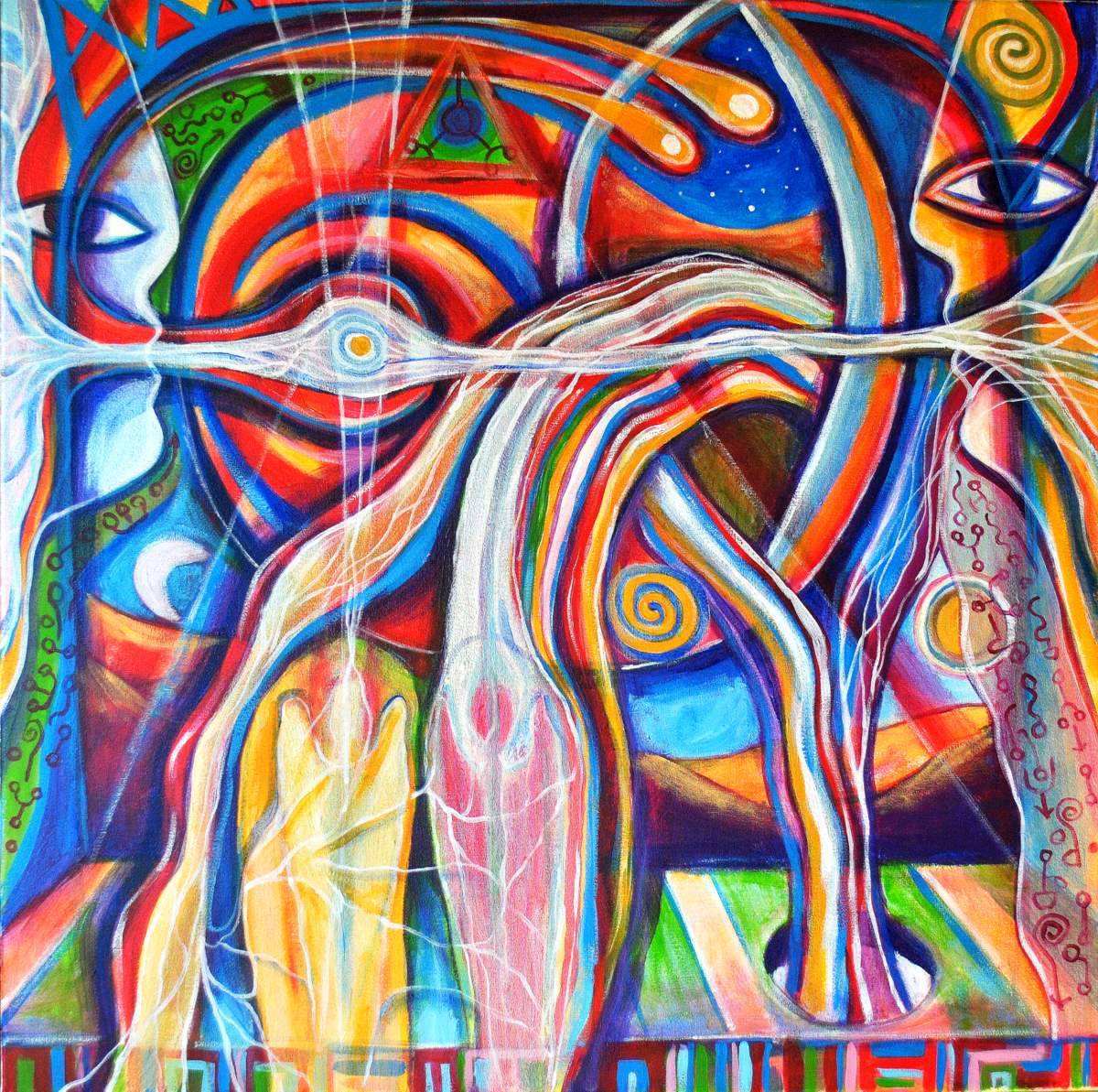 Obraz, który mamy przed sobą, to prawdziwa feeria barw. Dominują intensywne czerwienie i błękity, które przeplatają się z żółciami i zieleniami. Wszędzie pełno jest dynamicznych linii i spiral, które tworzą prawie hipnotyczną kompozycję. Centralny motyw zdaje się krzyczeć swoim chaosem, ale jednocześnie zachowuje pewną harmonię. Jest tam jakby olbrzymie drzewo albo może jakiś magiczny wodospad. Zawiera chyba każdy kolor tęczy. Styl artystyczny przypomina trochę surrealizm, z odrobiną impresjonizmu. Można poczuć, jakby artysta bawił się pędzlem, a kolory wyskakiwały spod jego palców. Cała scena jest bardzo "energetyczna". Czujesz jak twoje zmysły tańczą. Jakby dzieło mówiło „obudź się, spójrz na mnie”. Obraz ma w sobie coś niezwykle emocjonującego. Może wywoływać poczucie zabawy, swobody, a nawet niepokoju, zależy jak na niego spojrzeć. Gdybym była dzieckiem, powiedziałabym, że to magiczny plac zabaw na jakiejś innej planecie. Patrząc na to, człowiek myśli: wow, co tam się dzieje. Każdy detal wymaga uwagi. Ogólnie: dzieło emanuje optymizmem. Jest jak uderzenie energii, które zalewa nas swoją intensywnością. Artysta z premedytacją użył różnych technik i stylów. To wszystko tworzy mieszankę trochę chaotyczną, ale bardzo engaging.