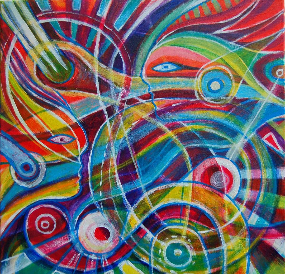 Obraz emanuje eksplozją kolorów – dominują jaskrawe czerwienie, zielenie i błękity, które splatają się w dynamicznej kompozycji. Linie przemykają przez płótno, tworząc abstrakcyjny wzór pełen energii i ruchu. Całość przypomina jazzową improwizację – każdy element odnajduje swoje miejsce w chaosie. Atmosfera dzieła jest pełna emocji, tak jakby artysta próbował uchwycić moment ekstazy. Obraz emanuje swego rodzaju optymizmem – patrząc na niego, można poczuć radość i spontaniczność. Technika, jaką posłużył się artysta, to prawdopodobnie akryl, co nadaje mu dynamiczności i głębi. Struktura farb sprawia, że mamy wrażenie, jakby wszystko żyło. Czuję się trochę jak dziecko, które patrzy na zabawkowy kalejdoskop i odkrywa nowe wzory. Hit of color sprawia, że nawet w szarą pogodę na zewnątrz, można poczuć słońce. Obraz prowokuje do zastanowienia się nad istotą emocji i tego, jak postrzegamy nasze codzienne życie. Wow, jak można nie być pod wrażeniem takiego chaosu? Dzieciak powiedziałby: "To wygląda jak tęcza, która gra w chowanego!". Patrząc na te kolory, czuć, że artysta miał coś ważnego do przekazania – może nadzieję, może pasję.