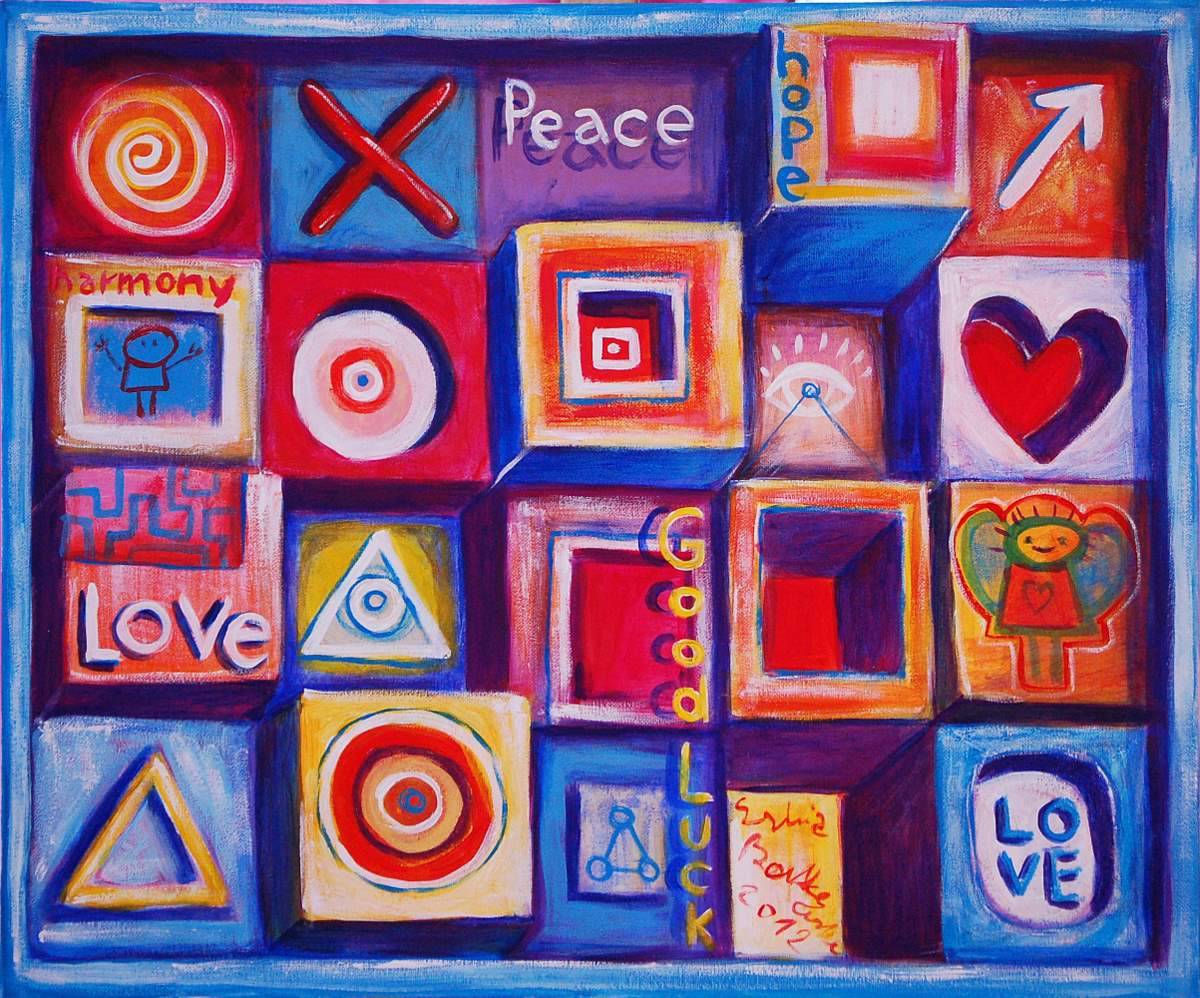 Obraz przypomina kolorowy patchwork pełen radosnych akcentów. Dominujące kolory to ciepłe czerwień, pomarańcz i żółć, które przeplatają się z chłodnym błękitem i fioletami. Wszystko to tworzy zaskakujący efekt mozaiki, wypełnionej geometrycznymi kształtami i symbolami. Kompozycja jest jakby złożoną z różnych kafelków, z których każdy ma swoje znaczenie i wywołuje inne emocje. Atmosfera jest pozytywna, pełna nadziei i optymizmu, dzięki napisom takim jak "Peace", "Love" czy "Good Luck". Artystycznie można zauważyć, że to dzieło jest pewnym rodzajem folk art, prostym, ale pełnym głębi w wyrażaniu emocji. Technika nawiązuje do naiwnego malarstwa, z grubymi, wyraźnymi pociągnięciami pędzla i nieco niedbałymi liniami. To tak, jakby artysta rozmawiał z nami poprzez język symboli. Może wywoływać u odbiorcy uczucie nostalgic tego, co proste i prawdziwe. Dla dziecka obraz może wydawać się jak magiczna układanka, pełna radości i odkryć. "To jest serduszko i uśmiechnięty aniołek!" mogłoby zawołać z zachwytem. Takie dzieło, z jego nieformalnym blaskiem, mówi bezpośrednio do serca, przypominając, że w chaosie barw i kształtów zawsze znajdzie się miejsce na harmonię i "hope".