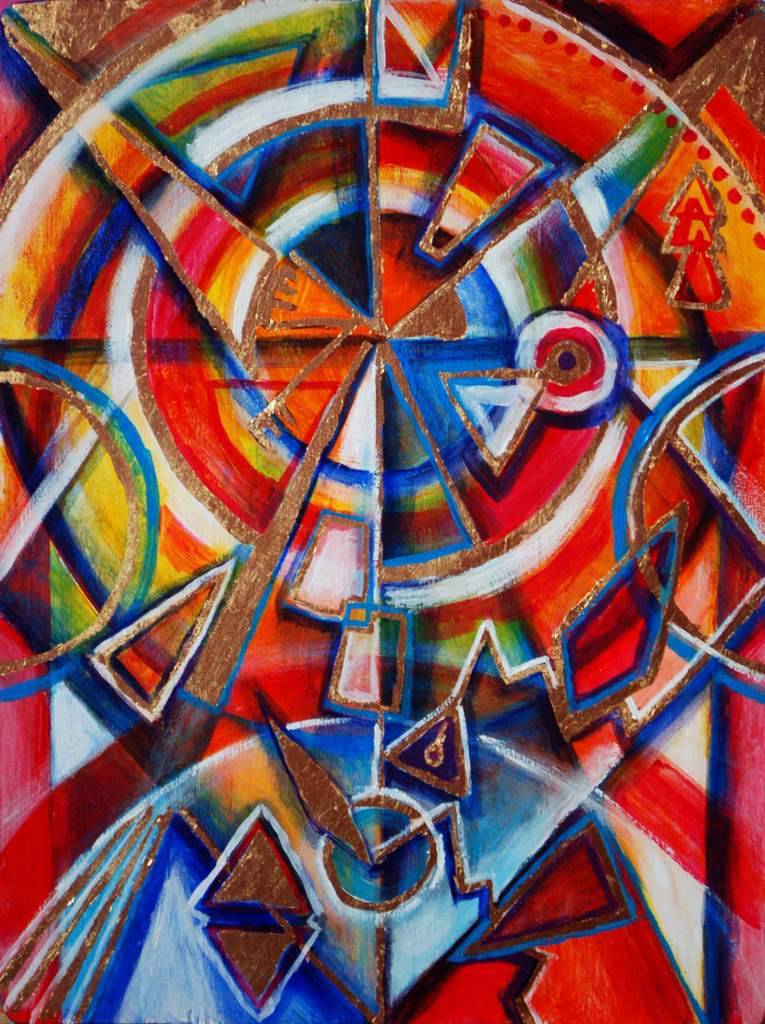Obraz eksploduje kolorami, niczym fajerwerki na niebie. Dominują czerwienie, niebieskie, zielone, z odrobiną złota, które tworzą wirującą kompozycję pełną geometrycznych kształtów i linii. Patrząc na niego, czujemy jakbyśmy byli w centrum ruchu, jakby wszystko wokół nas tańczyło. Wow, tu się dzieje prawdziwa magic! Atmosfera emanuje energią, dynamizmem. To jak podróż w krainę abstrakcji, gdzie każdy kolor i kształt ma swoją własną historię do opowiedzenia. Styl artysty jest odważny, a technika przypomina ekspresjonizm abstrakcyjny z nutą kubizmu – dominuje tutaj chaos kontrolowany przez zharmonizowane formy, które jednak zaskakują i przyciągają wzrok. Obraz wzbudza emocje, od poczucia złożoności po eksplozję radości. Coś jak rollercoaster – na początku nie wiesz, czego się spodziewać, ale potem po prostu cieszysz się jazdą. To miejsce pełne "surprises", które za każdym spojrzeniem odkrywa coś nowego. Moje oczy, aż bolą od intensywności barw, ale nie mogę przestać patrzeć. Dla mnie to obraz życia, pełen kontrastów, różnorodności, jak nasze codzienne zmagania. Czy ty też dostrzegasz te łososie na czubku? Mój mały kuzyn by powiedział, że to jakby grać w planszówkę pełną przygód! Obraz inspiruje do refleksji nad tym, jak piękno może tkwić w niespodziewanej harmonii chaosu.