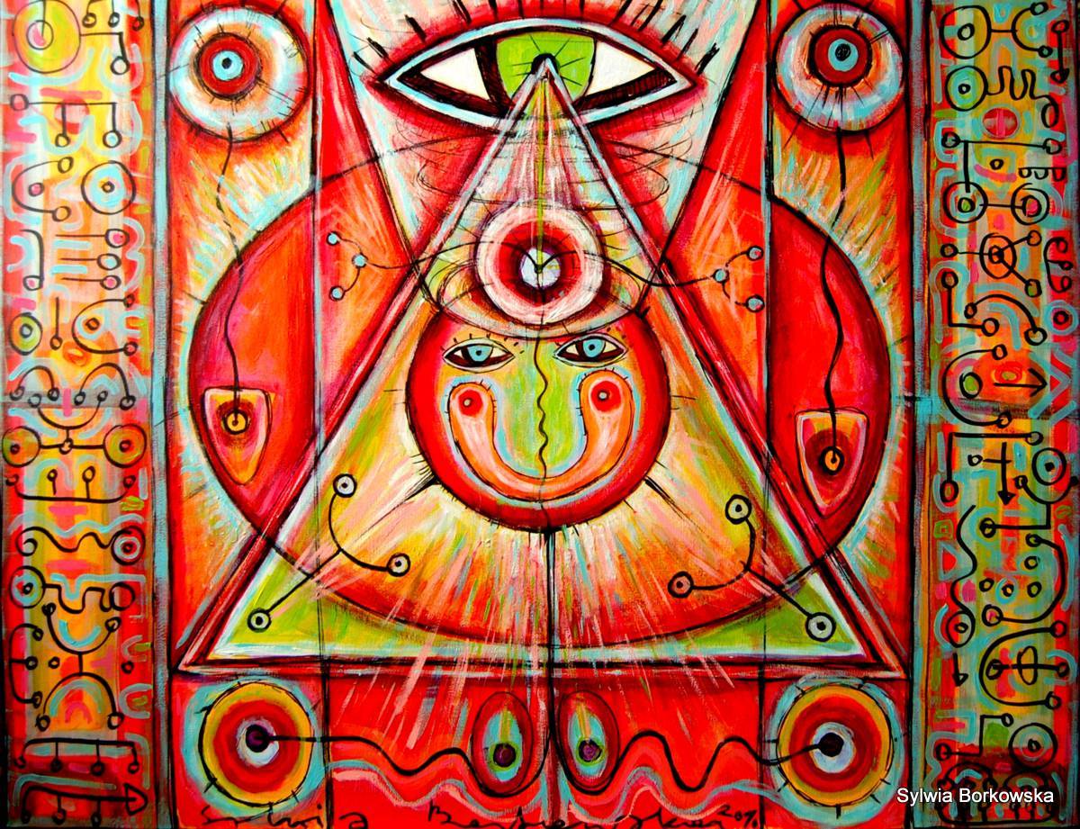 Obraz, który przyciąga wzrok od pierwszej chwili, mieni się intensywnymi kolorami: czerwienie, pomarańcze i zielenie tworzą hipnotyzującą mozaikę. Centralna postać, uformowana na kształt trójkąta, zdaje się patrzeć na widza przenikliwym okiem umieszczonym na górze kompozycji. Wokół znajdują się rozmaite, symetryczne wzory przypominające tajemnicze hieroglify, które zachęcają do odkrywania ukrytych znaczeń. Jest tu coś elektryzującego, coś co sprawia, że obraz ma intrygujący klimat tajemnicy i mistycyzmu. Kunst ma w sobie nutę surrealizmu, a jednocześnie odrobinę undergroundowego stylu street artu, jakby artystka bawiła się formą. Technika jest żywa, linie są dynamiczne, a kolory niemal pulsują energią. Wygląda to jak sen, w którym tajemnicze znaki i figury budzą w widzu uczucie zadziwienia i pewnej tajemniczej radości. "To wygląda jak ufoludki!" – powiedziałby mały chłopiec, nie kryjąc ekscytacji. Dla niektórych może to być odzwierciedlenie wewnętrznej walki czy podróży duchowej. Może nawet reminiscencja z dziecięcych marzeń, czysta i nieokiełznana. Fascynujące, jak takie obrazy potrafią prowokować różne myśli, prawda? Artysta bawi się konwencją tradycyjnych form artystycznych i wprowadza element playful chaos, budując obraz pełen niespodzianek. To przyciąga i nie pozwala się oderwać na dłuższą chwilę.