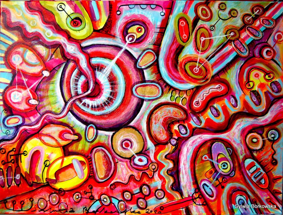 Ten obraz to prawdziwa eksplozja kolorów i kształtów, które przyciągają wzrok na pierwszy rzut oka. Dominują nasycone czerwienie, różne odcienie żółci i błękitu, a wszystko to splecione w wirach i spiralach tworzących swego rodzaju chaotyczną harmonię. Kompozycja jest dynamiczna, pełna zaokrąglonych form i niemalże kosmicznych wzorów. Atmosfera dzieła jest ekstrawertyczna i pełna energii, emanuje poczuciem radości i swobody, jakby artysta próbował przekazać spontaniczność chwili. Styl jest abstrakcyjny, może nawet surrealistyczny, z wyraźnymi śladami pędzla i intensywnie kontrastującymi kolorami. Artysta wykorzystał techniki malarskie, które nadają teksturę i głębię. Ta kompozycja może budzić różnorodne emocje, od euforii po zagubienie, zachęcając do refleksji nad ukrytym znaczeniem. Dziecko mogłoby powiedzieć: "Te kolory są jak cukierki na obrazku!". Cóż, i coś w tym jest! Overall, obraz przywołuje na myśl festiwal barw, który każdy interpretuje na swój sposób. Z pewnością jest to dzieło, które można oglądać godzinami, odkrywając za każdym razem coś nowego. Co myślisz?