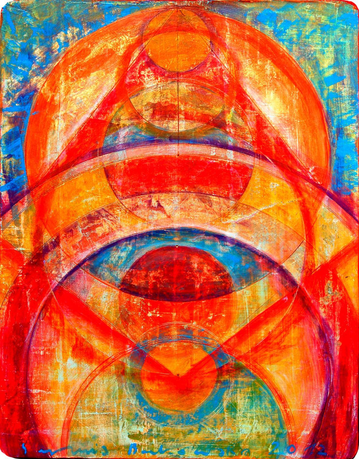 Obraz emanuje intensywnymi kolorami. Przewaga czerwieni, pomarańczy i niebieskości sprawia, że czujemy się jak w wirze energii i świateł. Kształty są wyraźne, dominują przede wszystkim koła i łuki, które nakładają się na siebie, tworząc dynamiczną kompozycję. To jak cyrk w pełnej krasie, gdy wszystkie światła migoczą jednocześnie. Artysta zastosował technikę nakładania warstw, co daje wrażenie głębi i ruchu. Kiedy się na to patrzy, można poczuć coś niezwykłego. Styl obrazu jest pełen pasji, to abstract w czystej formie. Te zamglone linie i zmiękczone krawędzie dodają mu tajemniczości. Nieco jakby ktoś malował palcami w ferworze twórczym uniesienia. To taki obraz co wprawia w zadumę. Jeden mały chłopiec powiedziałby: „To wygląda jak kolorowy balon na niebie!”. No właśnie. To niesie w sobie coś magicznego. Taka eksplozja barw sprawia, że serce bije szybciej. Może to poczucie chaosu, może harmonia odnaleziona w chaosie. Wow, po prostu cudowne! Emocje rozpryskują się jak fontanna radości. Ten piece of art, to prawdziwy rollercoaster dla oczu i duszy.