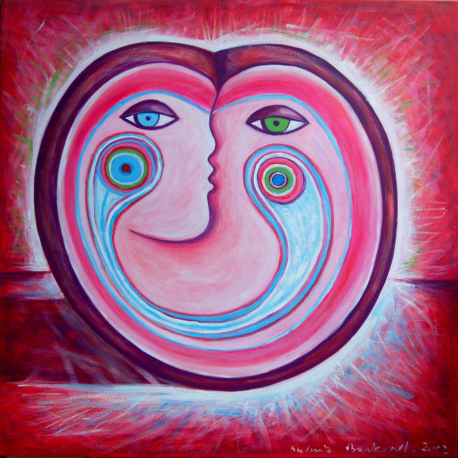 Na obrazie dominuje pełnia kolorów, których głębię wzbogaca intensywna czerwień tła. Centrum dzieła przyciąga wzrok owalna forma przypominająca twarz uformowaną z dwóch półkul o psychodelicznych wzorach. Kolory, jak błękity i róże, wirują w symetrycznej harmonii, wciągając w hipnotyczny taniec. Dość surrealistyczny styl, prawda? Dzięki swojej abstrakcyjnej formie, obraz zdaje się oscylować między rzeczywistością a snem. Jakby wewnętrzny świat emocji i myśli materializował się na płótnie. Artystyczna technika zdradza ślady pewnego kubistycznego zacięcia, choć w bardziej "free" wydaniu. Linie są płynne i dynamiczne. To trochę jak spirala emocji, które mieszają się i przekształcają bez końca. Patrząc na to wszystko, czuje się mieszankę spokoju i ekscytacji. Pewien rodzaj medytacyjnej energii. Nastrój jest refleksyjny, ale i nieco figlarny. Może to dzieło jest o dwóch duszach splatających się w jednym kręgu? Wzbudza ciekawość i prowokuje do myślenia, a jednocześnie czujemy pewien fuzzy warmth, który otula i uspokaja. Dziecko powiedziałby: Ojej, jak kolorowe buzie! Obraz może w sobie kryć dwoistość ludzkiej natury, pokazując, że czasem przeciwieństwa tworzą pełnię. Fascynuje, prawda?