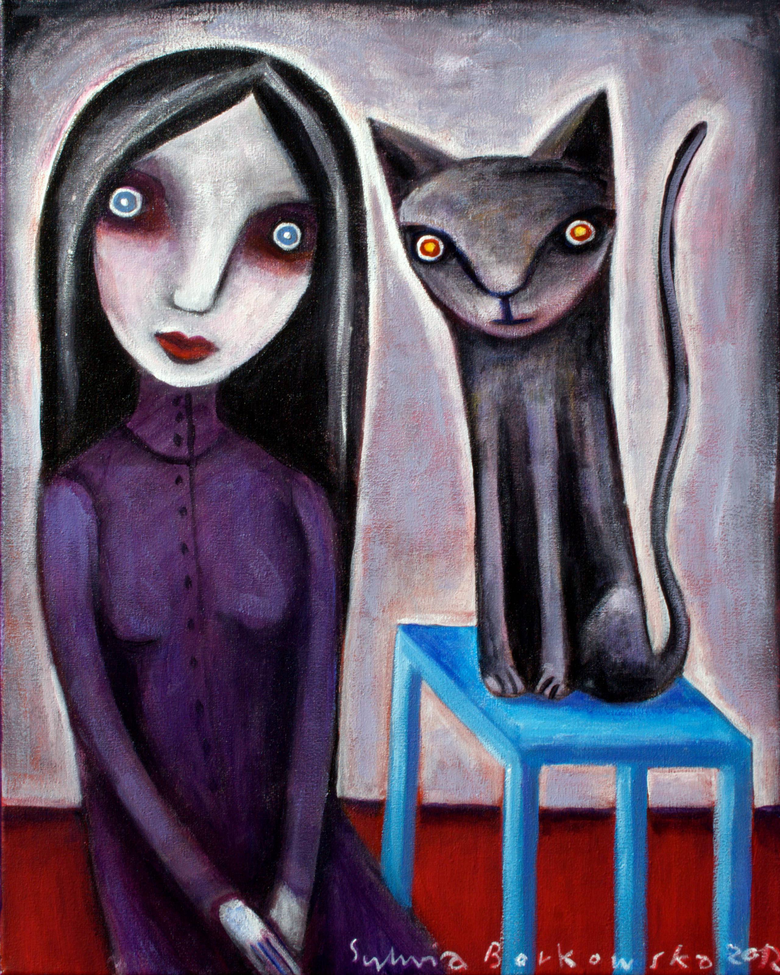 Obraz przykuwa wzrok intensywnymi kolorami, dominują tu głównie odcienie fioletu, szarości i niebieskiego. Postać kobiety o wydłużonej twarzy i szerokich oczach przypomina trochę postacie z baśni. Jej włosy są ciemne, a ubranie ma głęboką purpurową barwę. Na pierwszy rzut oka, to właśnie te oczy—big and round—przyciągają uwagę. Obok niej siedzi tajemniczy kot o równie przenikliwych, pomarańczowych oczach. Ich spojrzenia wydają się skrywać jakąś tajemnicę, coś, czego nie mówią wprost. Atmosfera obrazu jest nieco posępna, ale jednocześnie intrygująca. Widać, że artysta posługuje się odważnymi konturami i płaskimi plamami barw, co nadaje dziełu prostoty i pewnej surowości. Styl przypomina nieco ekspresjonizm, gdzie emocje są ważniejsze od realizmu. Obraz może wywoływać różne skojarzenia. Może nawet trochę strach, jak mgła w jesienny wieczór, kiedy idziesz przez las i czujesz, że coś cię obserwuje. Dziecko mogłoby powiedzieć: "Ten kot ma oczy jak lampki choinkowe!" A ja patrzę na tę dwójkę i zastanawiam się, jakie opowieści snują po zmroku. To jak fragment nieznanej historii, obraz, w którym każda plama koloru kryje emocję. Sztuka ta to swoisty „whisper” wśród malarskich opowieści. Patrzę i myślę o zagadkach, które trudno rozwiązać. Ten obraz zostawia mnie z poczuciem zaciekawienia i lekkiego niepokoju.