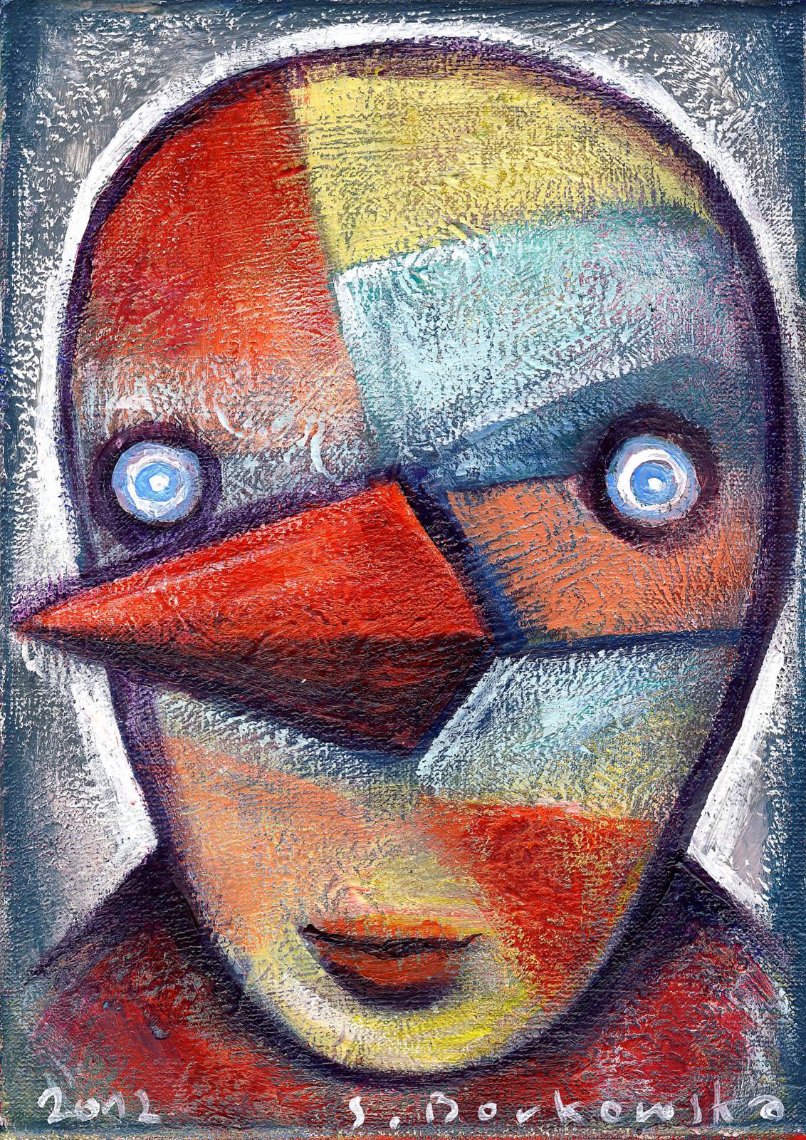 Obraz emanuje intensywnymi kolorami i geometrycznymi kształtami, które przyciągają wzrok od pierwszej chwili. Dominują tu czerwienie, żółcie i błękity, tworząc dynamiczny kontrast, który ożywia całą kompozycję. Postać na obrazie ma niezwykłą, niemalże ptasią twarz z ostrym, wydłużonym nosem i dużymi, okrągłymi oczami. Ech, te szczegóły nadają całemu dziełu surrealistyczny nastrój. Chciałoby się powiedzieć, że to trochę magiczne, trochę niewiarygodnie fantastyczne. Styl, w jakim artysta pracował, przypomina nieco kubizm – wszędzie pełno tu zabawy formą i kolorem, techniki sugerują grubo nakładaną farbę, mogącą tworzyć wyraźną fakturę na powierzchni. Czując na sobie spojrzenie tej postaci, można odnieść wrażenie, że obraz zadaje pytanie, któremu trudno się oprzeć – "Kim jesteś?" Albo tak jakby mówił "Hello". To dzieło bawi się percepcją, zachęca do refleksji i wręcz zaprasza odbiorcę na poszukiwania własnych znaczeń w tym kolorowym chaosie. Moje serce bije mocniej, bo takie zestawienie kolorów zawsze ożywia wnętrze duszy człowieka, jakby obrazy chciałyby powiedzieć – życie jest pełne niespodzianek.