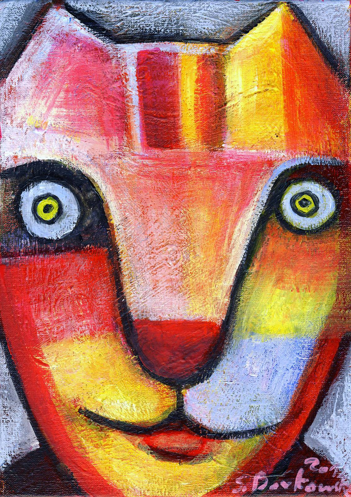 Na obrazie widać stylizowany portret kota, którego oczy wręcz hipnotyzują. Kolory są intensywne, dominują ciepłe odcienie czerwieni i żółci, kontrastujące z chłodnymi plamami niebieskiego. Kształty są geometryczne, a kompozycja dynamiczna, niemalże pulsująca energią. Atmosfera obrazu jest nieco surrealna, jak z kolorowego snu, gdzie rzeczywistość miesza się z dziecinną fantazją. Styl artystyczny przypomina kubizm, artysta użył grubo nakładanej farby, co dodaje teksturze i głębi obrazu. To połączenie klasyki z nowoczesnością, takie artystyczne free-spirited podejście. Emocje, jakie obraz może wywoływać, są równie zróżnicowane. Można poczuć radość, zaskoczenie, a nawet lekkie niepokojenie tym intensywnym spojrzeniem kota. Obraz przemawia do wewnętrznego dziecka, które wciąż szuka ukrytej magii w codzienności. Patrzę na ten obraz i czuję, że mogłabym rozmawiać z tym kotem godzinami! Czy on chce coś powiedzieć? Może „Cześć, pobawmy się!”. Fascynująca jest ta nieoczywista narracja, jaką dzieło oferuje, bo za każdym razem odkrywamy coś nowego.