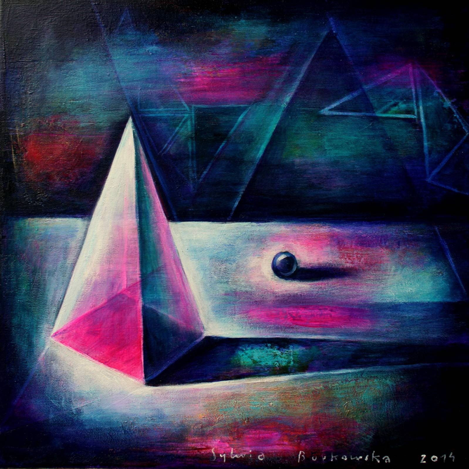 Na obrazie dominuje geometryczny motyw, pełen energii i intrygujących kształtów. W centrum uwagi jest szklana piramida, błyskająca odcieniami różu i błękitu. Te kolory budują wyjątkowy kontrast z ciemnym tłem, które nadaje głębi i tajemnicy całej kompozycji. Tuż obok piramidy znajduje się kula, która wydaje się niemal unosić w powietrzu. Całość skąpana jest w miękkim świetle, co tworzy dreamlike atmosferę. Artysta z powodzeniem łączy techniki impresjonizmu z modernizmem, używając dynamicznych pociągnięć pędzla. Oglądając ten obraz, czuję nutkę nostalgii, jakby przywoływał wspomnienia z dzieciństwa. Mamo, to chyba latająca piłka! Wywołuje to uśmiech na twarzy. Styl malowania jest śmiały i kreatywny, z wyraźnym zaznaczeniem linii i cieni. Czuć tu puls energii, jakby każdy element płótna miał swoje własne "heartbeat". Dzieło emanuje fascynującym spokojem, ale i pewnym napięciem. Obraz może skłonić odbiorcę do refleksji nad naturą wszechświata, snując rozważania o równowadze między stabilnością a chaosem. Magiczne to takie – że sztuka może bawić się kolorami i kształtami w taki sposób, że każdy dostrzega w nim coś completely innego.