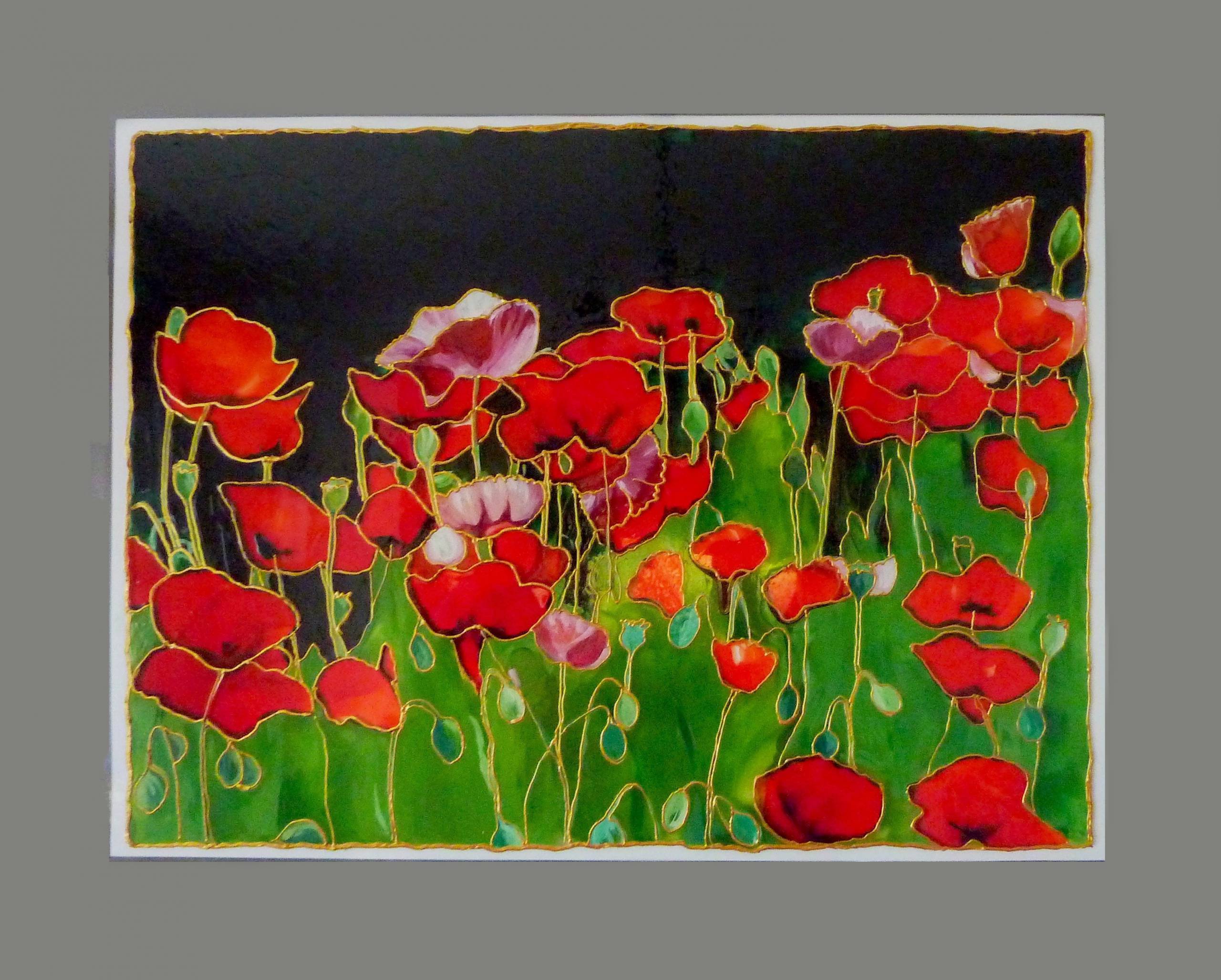 Obraz malowany farbami witrażowymi na szkle, przedstawiający pole maków.