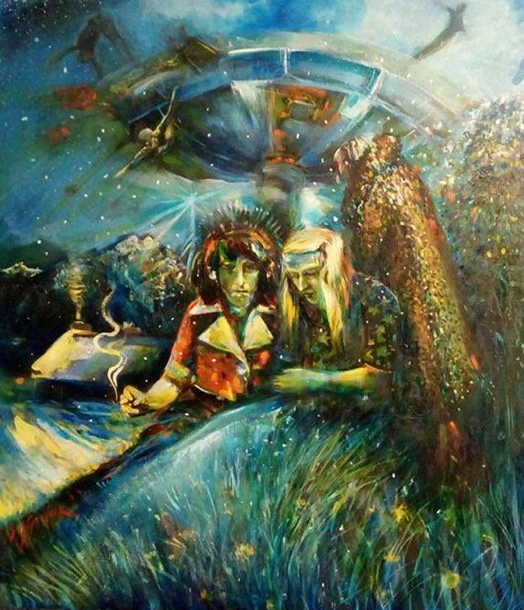 Obraz jest żywą eksplozją kolorów i form. Dominują odcienie zieleni i niebieskiego, które tworzą niemal kosmiczny krajobraz. Kompozycja jest gęsto zapełniona detalami, które przyciągają oko: tajemnicze postacie skupione wokół dziejącego się w centrum zdarzenia, a w tle niby kosmiczny statek. Atmosfera obrazu jest surrealistyczna i nieco niepokojąca, jakbyśmy zaglądali do innego wymiaru pełnego tajemnic. Styl artystyczny to mieszanka elementów impresjonizmu i surrealizmu. Artysta używa dynamicznych pociągnięć pędzla, co nadaje scenie wyjątkową energię. Można poczuć, jakby obraz żył własnym życiem, niemalże szeptał własne opowieści. Techniki zastosowane tutaj, czyli kontrastujące barwy i światłocienie, dodają głębi i wymiaru całej scenerii. Obraz może wywoływać różne emocje, od zdziwienia po zafascynowanie. Dla mnie osobiście to jak jazda rollercoasterem w głąb snu. Wow! Może budzić przypływ dziecięcej wyobraźni, jakbyśmy widzieli ulubioną bajkę na jawie. Jedno ze zdań mogłoby mówić, że "wszystko tu jest takie magiczne!". To dzieło na pewno skłania do refleksji nad postaciami i miejscem, gdzie się znajdują. A little mystery w tej kompozycji sprawia, że można ją interpretować na wiele sposobów, zastanawiając się nad historią bohaterów. Emanująca z obrazu atmosfera intryguje i zachęca do dłuższego zatrzymania się przy nim.