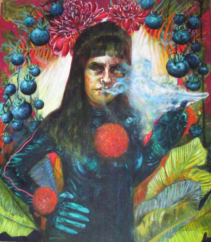 Obraz emanuje intensywnymi kolorami i surrealistyczną kompozycją. Dominują w nim głębokie odcienie niebieskiego i czerwieni, które kontrastują z tropikalnymi liśćmi w tle. W centrum postać o intensywnym spojrzeniu wydaje się być zamyślona, a jej wyraz twarzy podkreśla tajemniczość. Kłęby dymu, unoszące się wokół niej, dodają atmosfery nieuchwytnej magii. Artysta używa mieszaniny realistycznych detali i abstrakcyjnych form, co tworzy unikalny styl. Technika pociągnięć pędzla jest dynamiczna, niemalże dzika, co dodaje obrazowi energii. Nastrój jest jednocześnie niepokojący i fascynujący, jakby z innego świata. Wywołuje emocje, zmuszając do refleksji nad tym, co rzeczywiste, a co fantastyczne. Kiedy patrzę na ten obraz, czuję się jakbym odkrywał sekrety wszechświata. Maybe it's just me, ale coś w tym jest. Przywołuje to uczucie, które można porównać do oglądania nietypowego snu. Zastanawiam się, co autor chciał przez to powiedzieć. Może to opowieść o wewnętrznej sile i tajemnicy, które każdy z nas nosi w sobie. To naprawdę niesamowite.