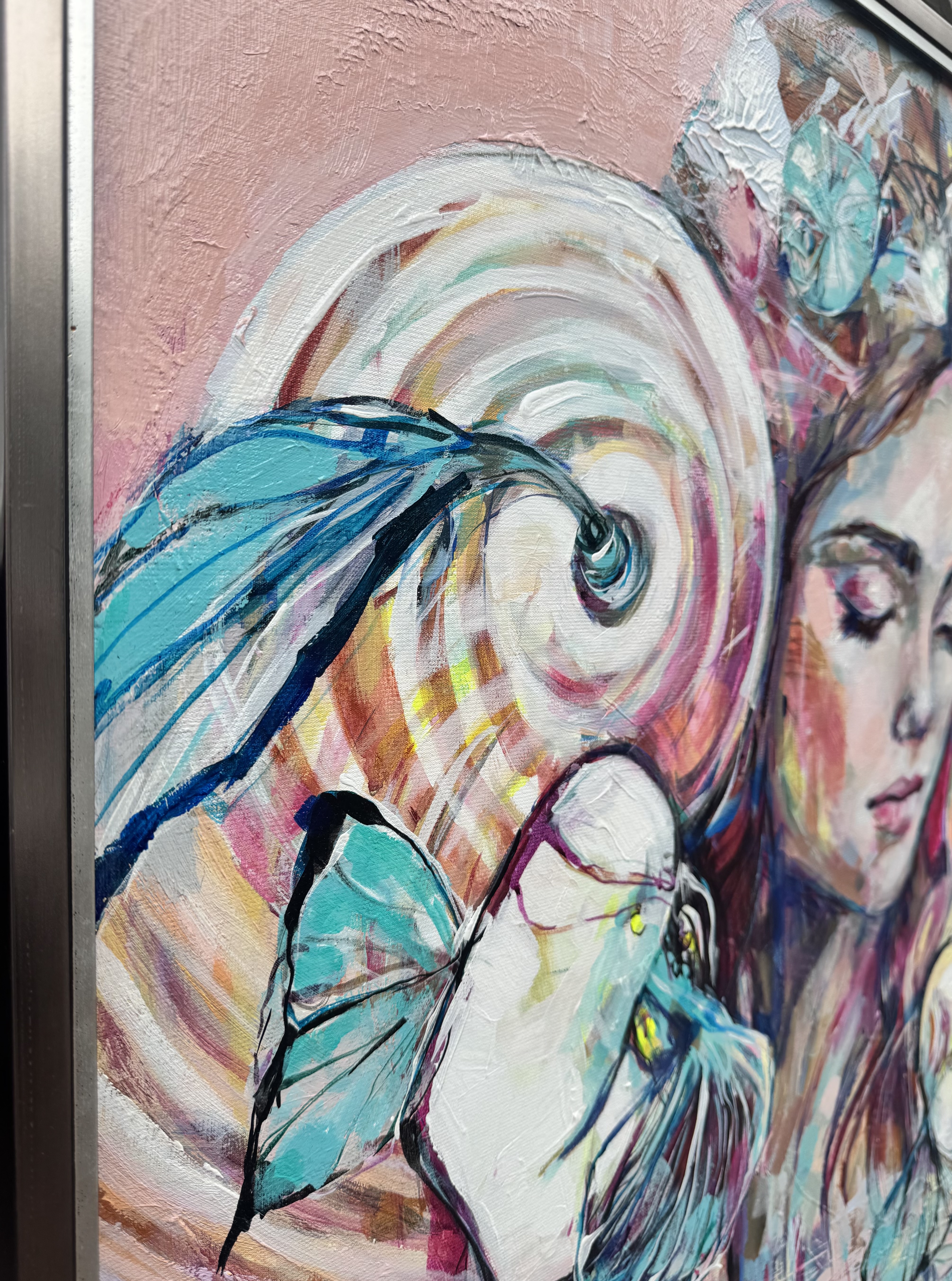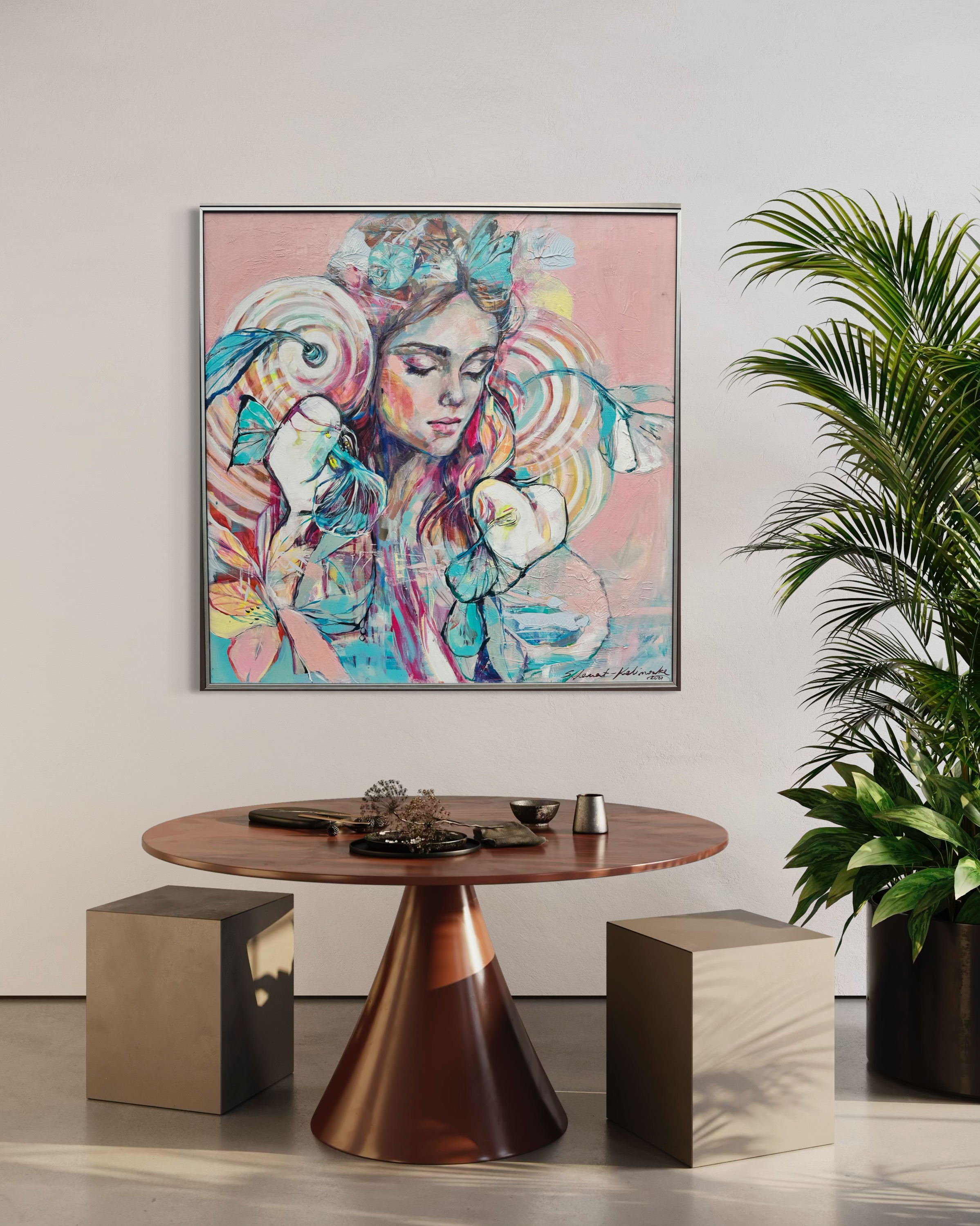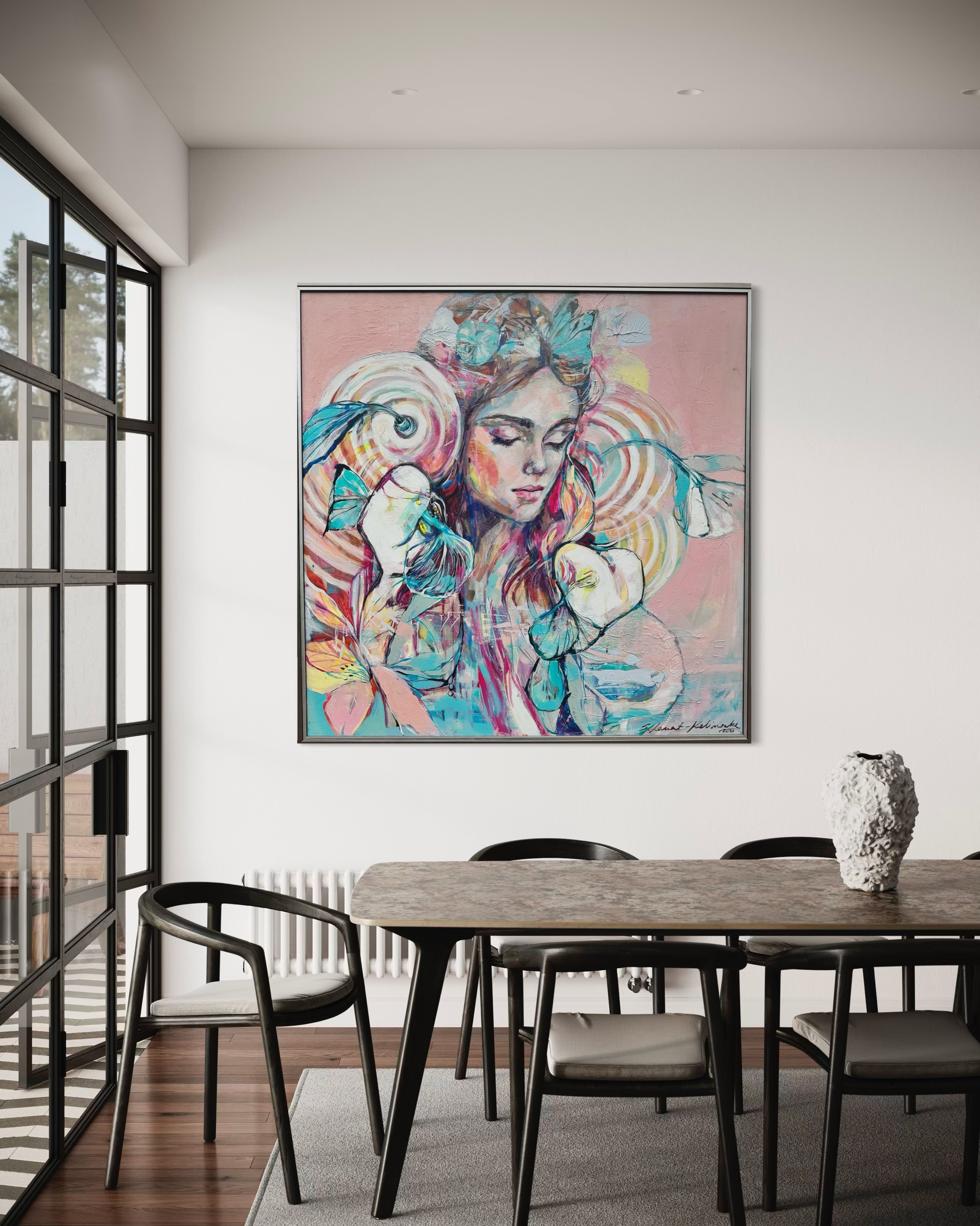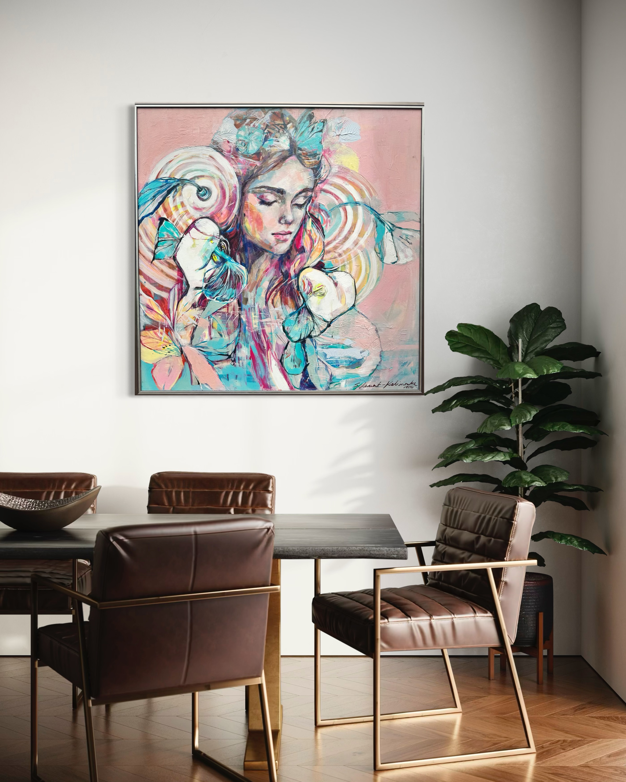 Obraz emanije niesamowitym spokojem i urokem. Dominują pastelowe kolory: różowy, błękitny i odcienie kremu, które tworzą delikatne przejścia. Postać kobiety na środku przyciąga wzrok swoją zamkniętą mimiką. Włosy przeplatają się z motywami kwiatowymi i motylami, co dodaje kompozycji lekkości i dreamlike quality. Spiralne wzory z tyłu głowy kojarzą się z nieskończonością, jak wirujące myśli. Całość malowidła przywołuje uczucie zatrzymania w czasie, jak gdyby świat wstrzymał oddech. Artysta z wprawą użył techniki mieszanej, łącząc grube pociągnięcia pędzlem z subtelnym cieniowaniem. Jest coś hipnotycznego w użyciu tych kontrastów – dynamika linii w zestawieniu z sennym wyrazem twarzy. Emocje płynące z obrazu mogą być różnorodne, od ukojenia po lekki smutek. To jak podróż do wnętrza samego siebie, gdzie każdy może odnaleźć coś innego. Patrząc na to dzieło, nie sposób nie zastanowić się nad chwilami ulotnymi jak motyle. Myślę sobie: wow, to musi być magia. Dziecko powiedziałoby: ona śpi i marzy o kwiatach. I choć wydaje się, że wszystko na płótnie jest dokładnie na swoim miejscu, nie boję się w tym artyzmie odnaleźć chaosu. Taki paradoks, prawda?