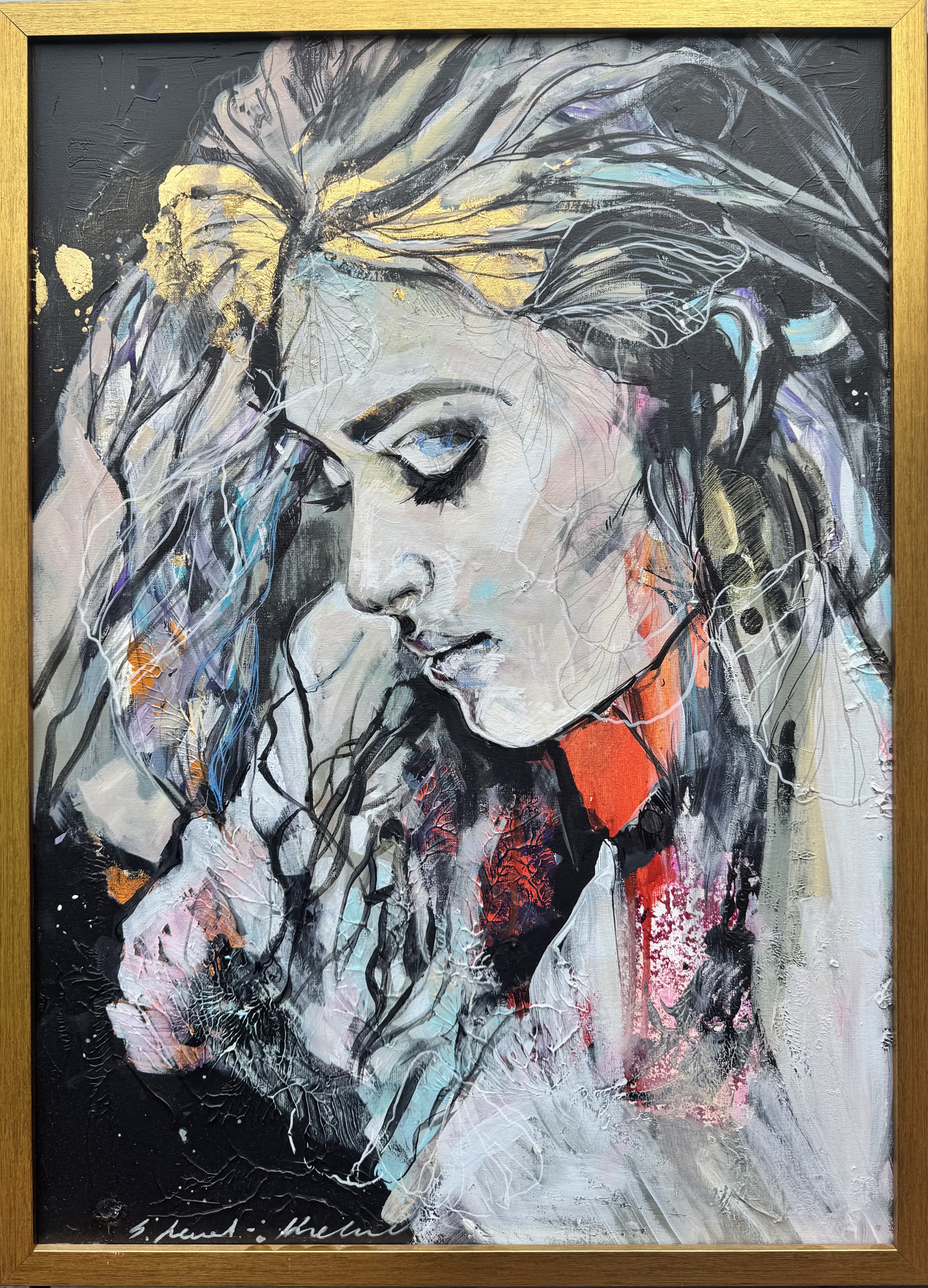 Obraz przedstawia tajemniczy portret kobiety zanurzonej w myślach. Jej twarz, pełna delikatnych kształtów, przyciąga uwagę subtelnymi odcieniami szarości i bieli, które kontrastują z mocnymi, złotymi akcentami w jej włosach. Tło ciemne, niemal czarne, sprawia wrażenie, jakby postać wyłaniała się z cienia, nasuwając myśl o tajemniczości. Kompozycja jest dynamiczna, z różnorodnymi plamami koloru, które eksplodują niczym confetti, dodając energii. Całość tworzy intensywny nastrój, emanujący spokojem, lecz z nutą niepokoju. Styl artysty balansuje na granicy między realizmem a abstrakcją, umożliwiając wiele interpretacji. Technika mieszana, z akcentami farby olejnej i akrylu, dodaje teksturowej głębi. Dzieci mówią: "Ona wygląda jak księżniczka z bajki!". Obraz może budzić w odbiorcy refleksję nad kruchością wewnętrznych przeżyć, przypominając o zawiłościach ludzkich myśli. It feels so alive, jakby każdy pociągnięcie pędzla miało swój własny rytm życia. To dzieło, które zapada w pamięć, zachęcając do kontemplacji nad tym, co ukryte pod powierzchnią codzienności.