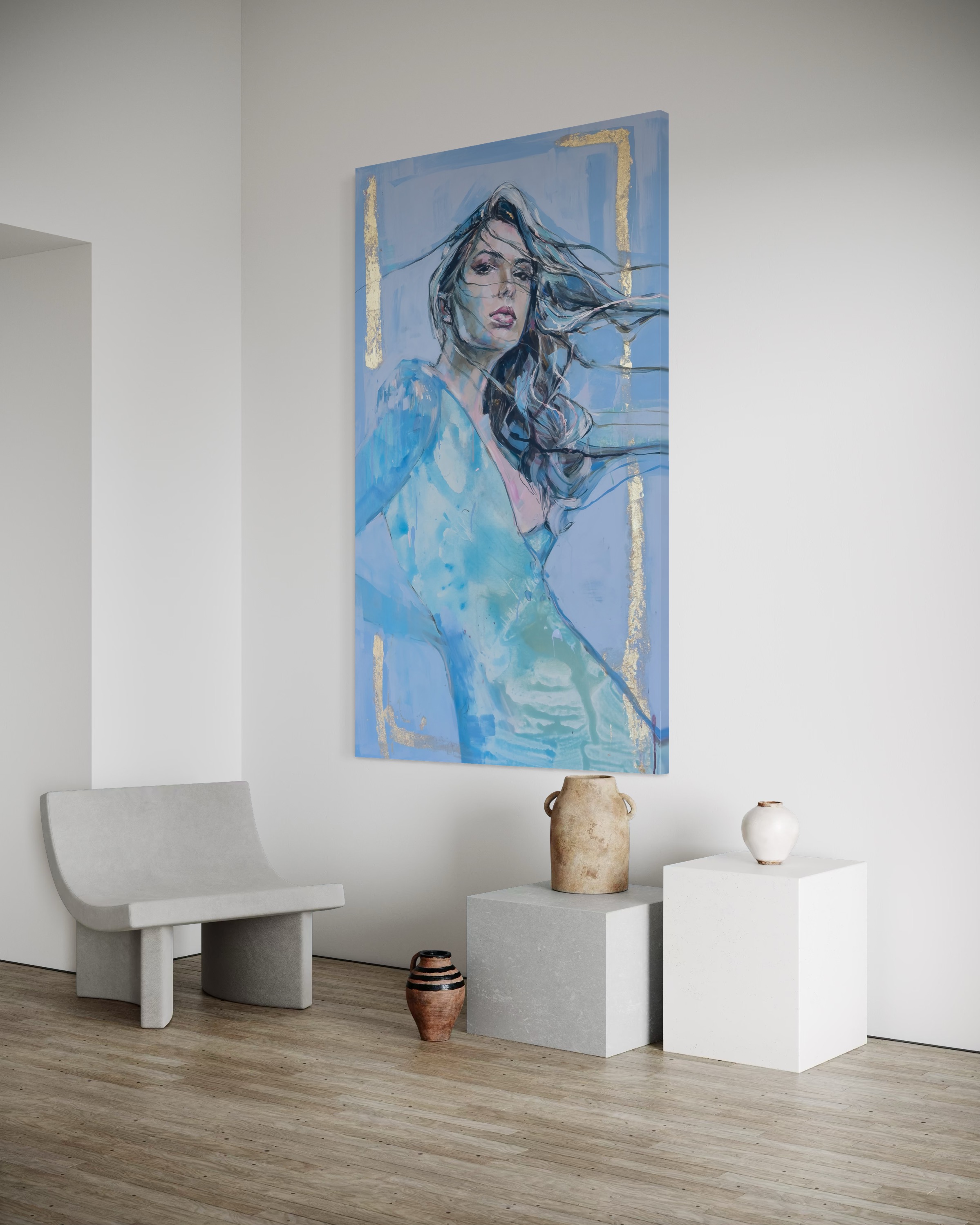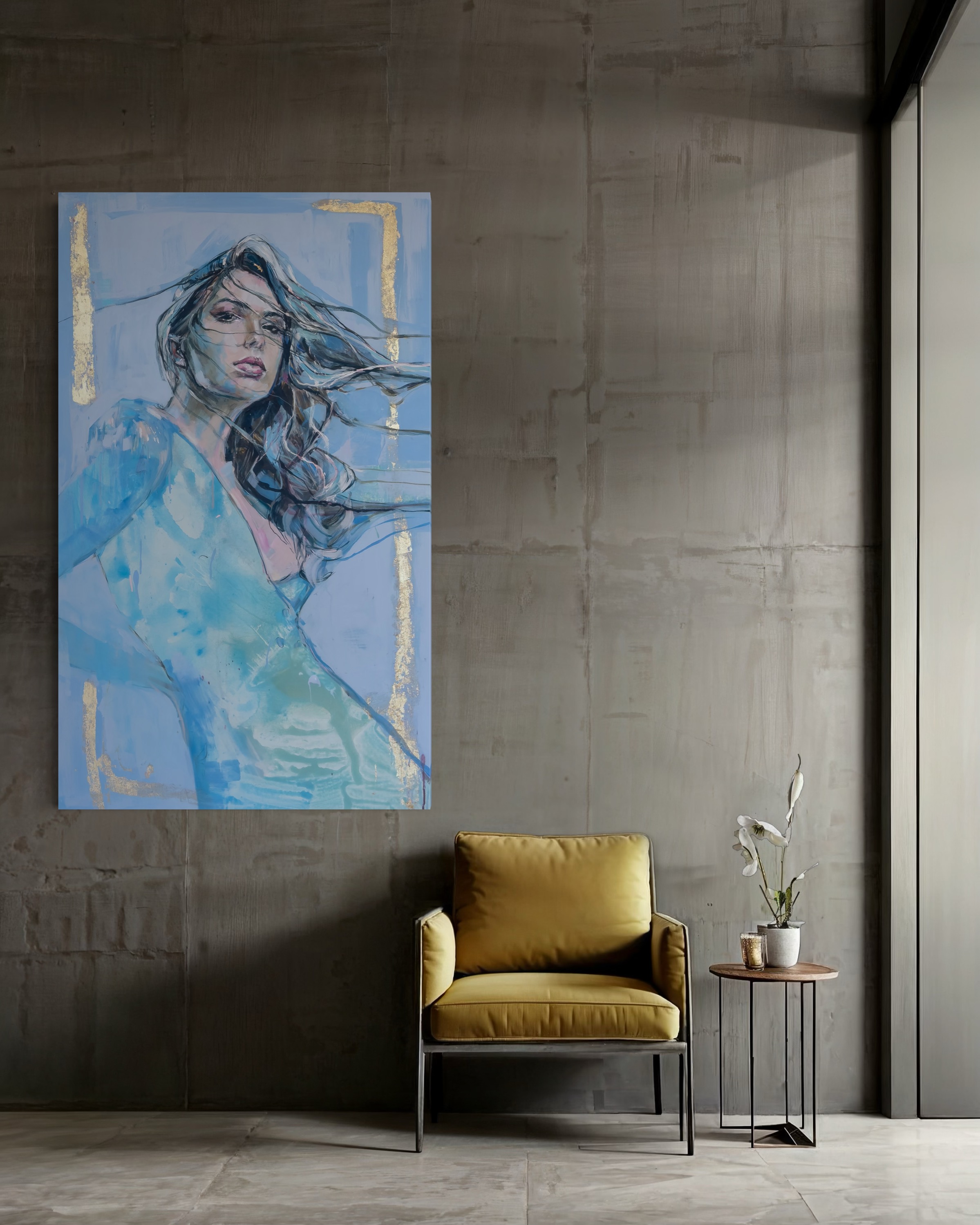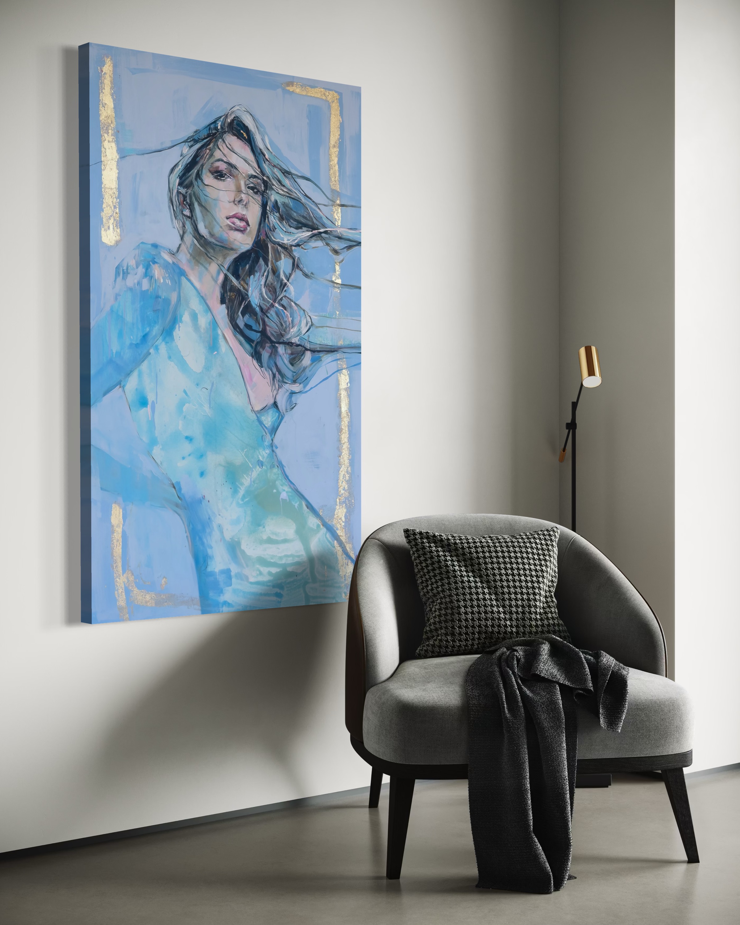 Obraz przyciąga wzrok swoją delikatną gamą kolorystyczną. Dominują tu odcienie niebieskiego, które przeplatają się ze złotymi akcentami, nadając dziełu elegancji. Kobieta na obrazie wygląda jakby była w ruchu, jej włosy unoszą się, tworząc dynamiczny efekt. Kompozycja jest dobrze zbalansowana. Jej twarz wyraża pewność siebie i spokój, a oczy patrzą z nutą tajemnicy. Nastrój obrazu jest jednocześnie lekki i inspirowany jakąś magią. Malarskie pociągnięcia pędzla wskazują, że artysta operuje techniką impasto, która dodaje teksturze głębi. Obraz wywołuje mieszankę podziwu i zachwytu. Może nasuwać myśli o marzeniach i wolności. "Wow, she looks like a princess!" pomyślałby pewnie mały widz. To dzieło, które tak jakby przypomina, że świat jest pełen piękna, wystarczy spojrzeć. Dla mnie jest w nim coś, co przyciąga i nie pozwala oderwać wzroku. Zjawiskowe, a jednocześnie subtelne.