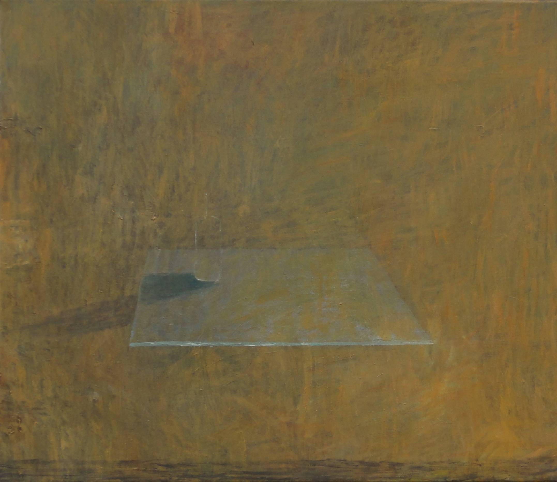Na obrazie dominuje delikatny chaos słomkowych i zielonkawych odcieni, które tworzą nieco mglistą atmosferę. Gładka, niemal niewidoczna płaszczyzna pośrodku zdaje się być punkt centralny. Artysta zastosował techniki mieszane, umożliwiając subtelne przejścia kolorystyczne. Niby jest to coś prostego, ale przyciąga wzrok i każe się zastanawiać. Jakby to była jakaś tajna mapka do skarbów? Kompozycja obrazu jest minimalistyczna, ale jej prostota emanuje spokojem i pewną melancholią. Ten obraz to jak cicha opowieść, którą każdy może interpretować po swojemu. Może to pustka, a może zapowiedź czegoś nadchodzącego? Jedno z tych dzieł, które sprawia, że człowiek zatrzymuje się na chwilę i myśli. It's intriguing! Wzbudza emocje zachwytu i zadumy, bo kto wie, co się kryje za tą prostotą. To jak zamek z piasku na plaży, którego jeszcze nie zniszczyła fala. Obraz jest jakby zaproszeniem do kontemplacji i refleksji nad tym, co niewidoczne na pierwszy rzut oka. Fascynujący w swojej enigmatycznej prostocie, sprawiający wrażenie, że czas się zatrzymał.